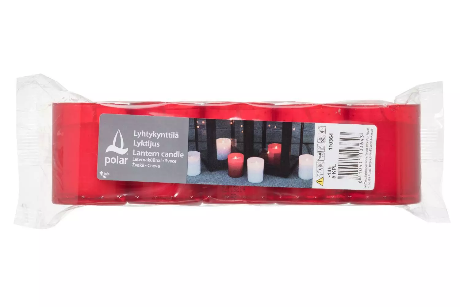 Lyhtykynttilä punaisessa muovikupissa. Pakkaus sisältää 5 kpl 40 x 55 mm:n kynttilää. Paloaika noin 14h.