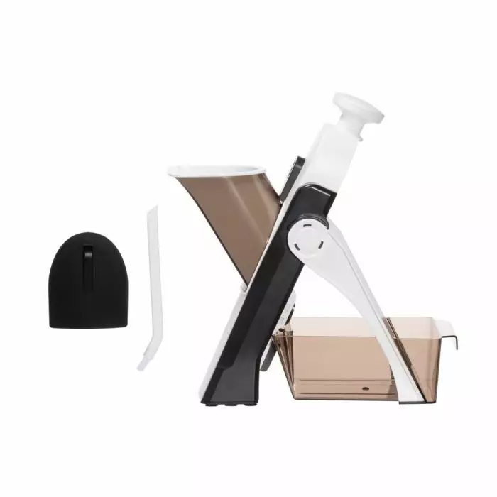 Turvallinen ja helppokäyttöinen pystymallin mandoliinileikkuri. Mandoliini nopeuttaa työskentelyä ja tekee tasalaatuista leikkausjälkeä. Mandoliinilla suikaloit, siivutat ja kuutioit vihannekset ja hedelmät nopeasti ja erityisen turvallisesti. Siivutettavaa tuotetta ei tarvitse itse liikuttaa terän päällä, vaan siivutettava tuote syötetään kouruun, työntäjällä tuote työnnetään kohti leikkausterää samalla kun mandoliinin kahvaa liikutetaan edestakaisin. Valmis tuote tulee keräysastiaan. Sormien ei siis tarvitse olla tekemissä terän kanssa. Mandoliinissa on paksuudensäätö (0,5 – 8 mm), joten sillä saadaan helposti leikattua eri paksuisia siivuja läpikuultavan ohuesta siivusta paksumpaan. Mandoliinissa on yksi säädettävä terä, jolla voi tehdä suikaleita, siivuja, kuutioita ja julienne-leikkausta. Luistamattoman jalustan ansiosta mandoliini pysyy käytettäessä hyvin paikoillaan. Kokoontaittuva rakenne, helppo säilyttää pienessä tilassa. Käsinpesu.