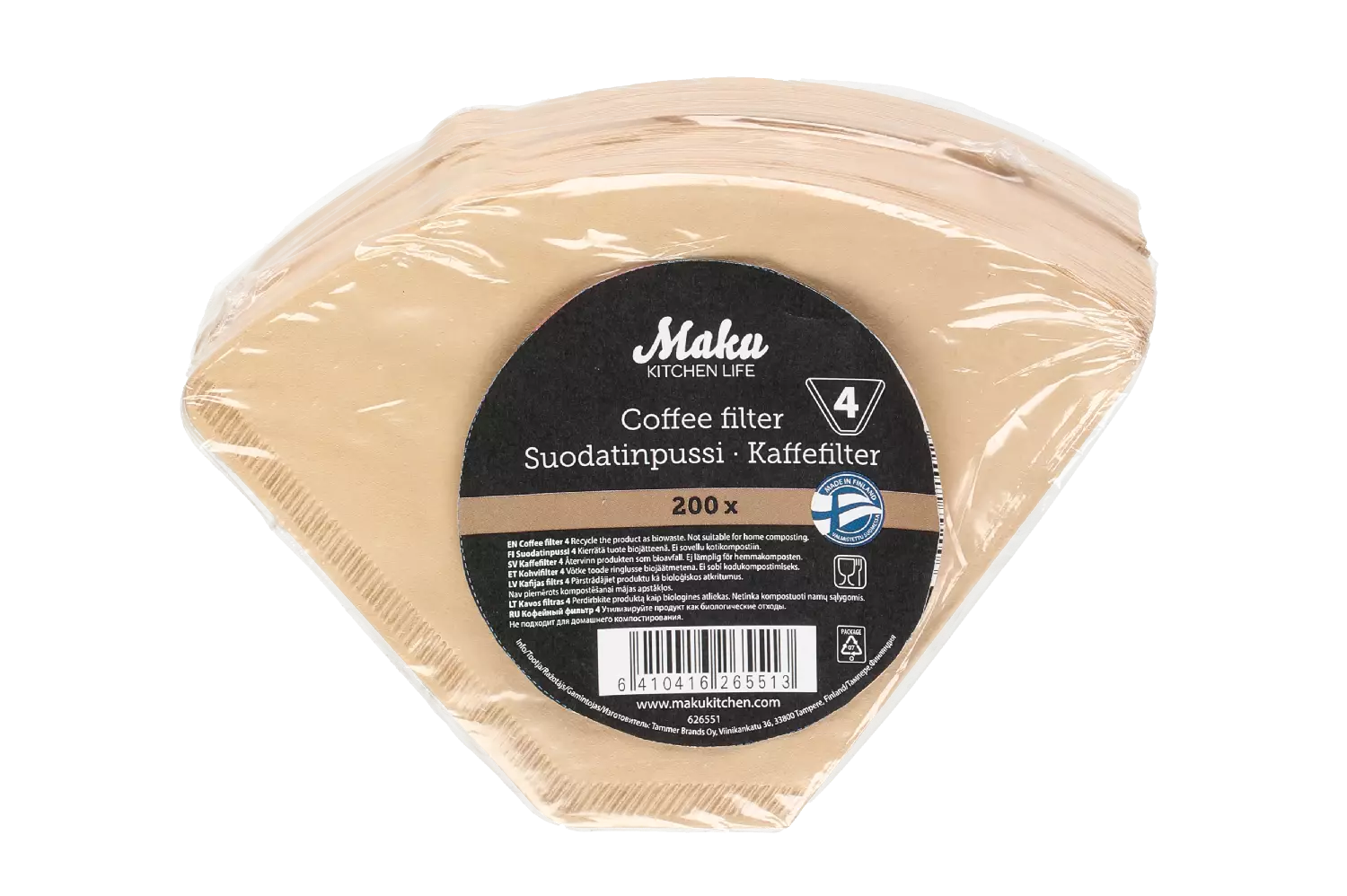 Valkaisematon suodatinpussi. Biohajoava, tuotteen kierrätys biojätteeseen. 200 pussia/pakkaus. Valmistettu Suomessa.