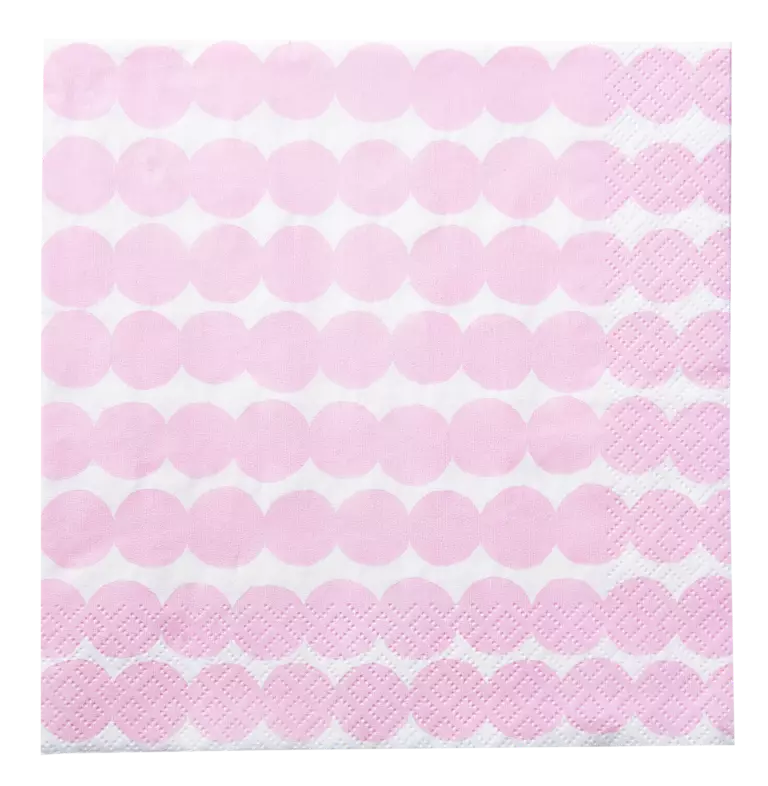 Klassiset Marimekon Räsymatto lautasliinat vaaleanpunaisessa värityksessä. Kuosin on suunnitellut Maija Louekari vuonna 2009. Kotimaiset lautasliinat ovat Havin valmistamat ja ne ovat painettu Imatralla 3-kertaiselle pehmopaperille. Lautasliinoille on myönnetty Avainlippu, Joutsenmerkki ja FSC.