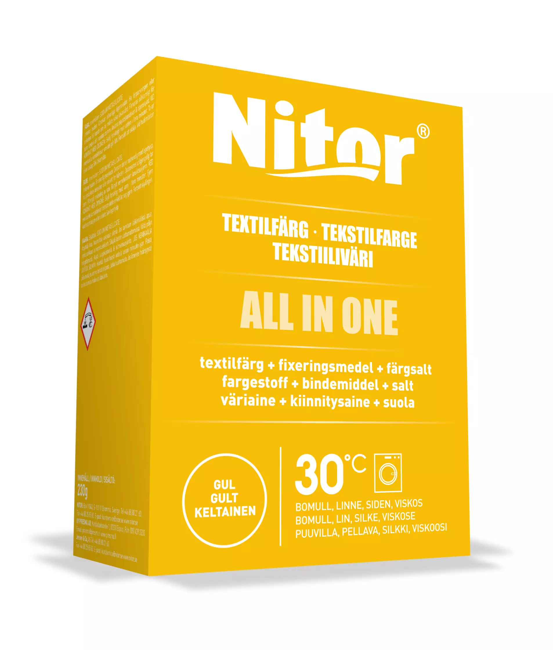 Soveltuu seuraavien kankaiden värjäämiseen: puuvilla, pellava, silkki, viskoosi, juutti, Tencel, Lyocell ja Modal. Nitor All in one -tekstiiliväripakkaus sisältää kaiken tarvittavan: väriaineen + kiinnitysaineen + suolan. 1 pakkaus Nitor All in one -tekstiiliväriä riittää värjäämään 200-600 g kuivaa tekstiiliä. Uudistettu - ei sisällä fosfaatteja.