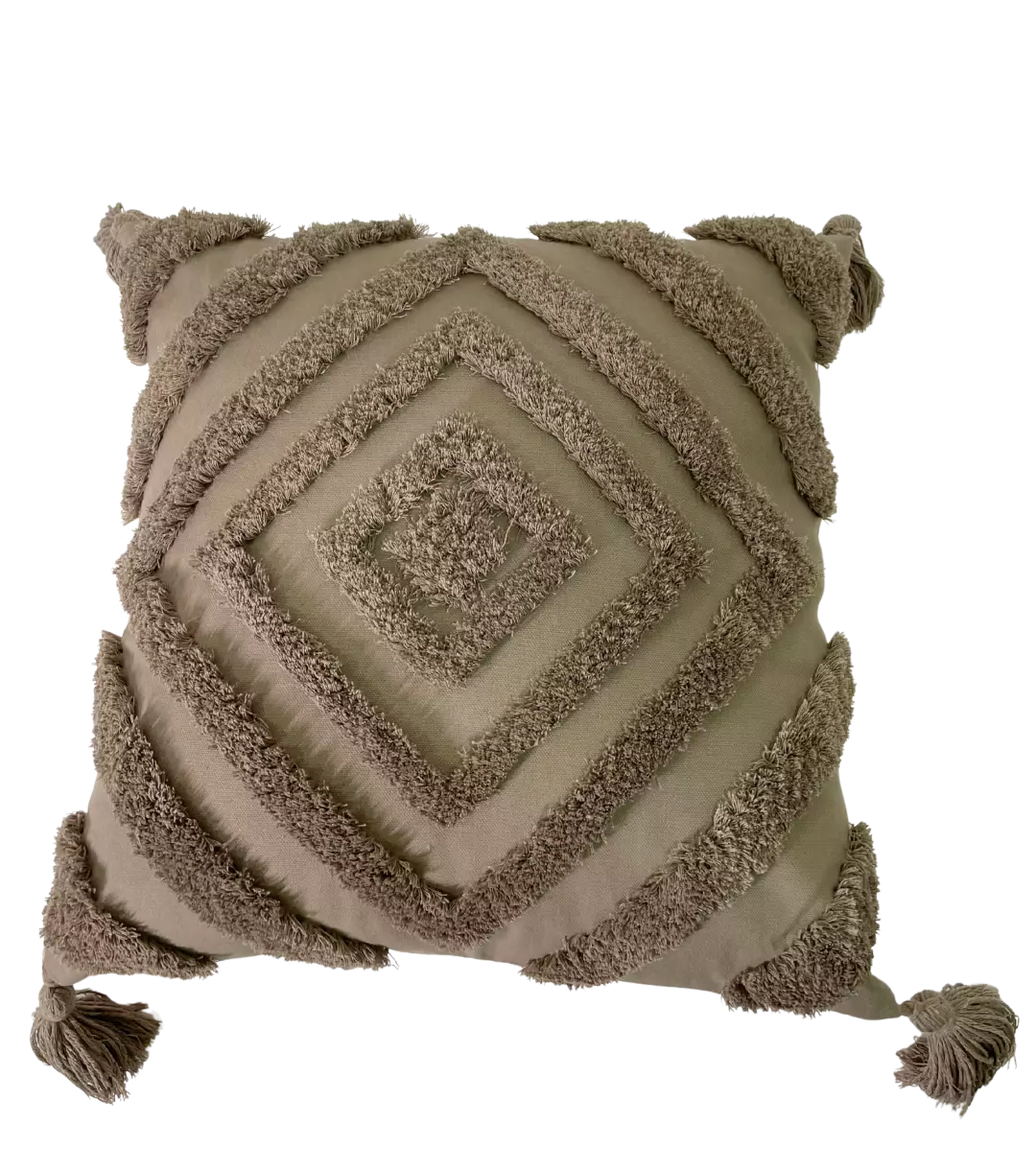 Sisustuksellinen puuvillasta valmistettu tyynynpäällinen kohokuvioinnilla, koristetupsut kaikissa kulmissa. Kangas: puuvilla 100% Täyte: polyesteri 100% Koko: 45x45cm