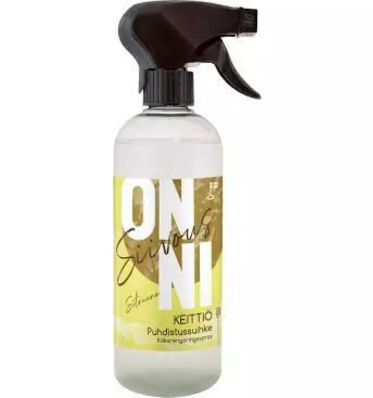 ONNI Keittiöpuhdistussuihke sitruuna on biohajoava puhdistusaine keittiön pinnoille. Tehokas rasvan- ja lianpoistaja. Jättää tilaan raikkaan sitruunan tuoksun. Sisältää huolella valittuja ainesosia uusiutuvista raaka-aineista. ONNI puhdistussuihkeet ovat vapaita eläinperäisistä raaka-aineista, ja pullo on valmistettu 100% kierrätetystä muovista. Kotimaisuudesta kertoo Avainlippu -merkki.