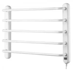 Valkoinen seinään kiinnitettävä sähkötoiminen Harju-kuivain pyyhkeiden ja muiden tekstiilien kuivattamiseen. Korkeus 600 mm. Leveys 450 mm. Helppo kytkeä, pistotulppajohto vain pistorasiaan. Johto ja kiinnikkeet mukana pakkauksessa.
