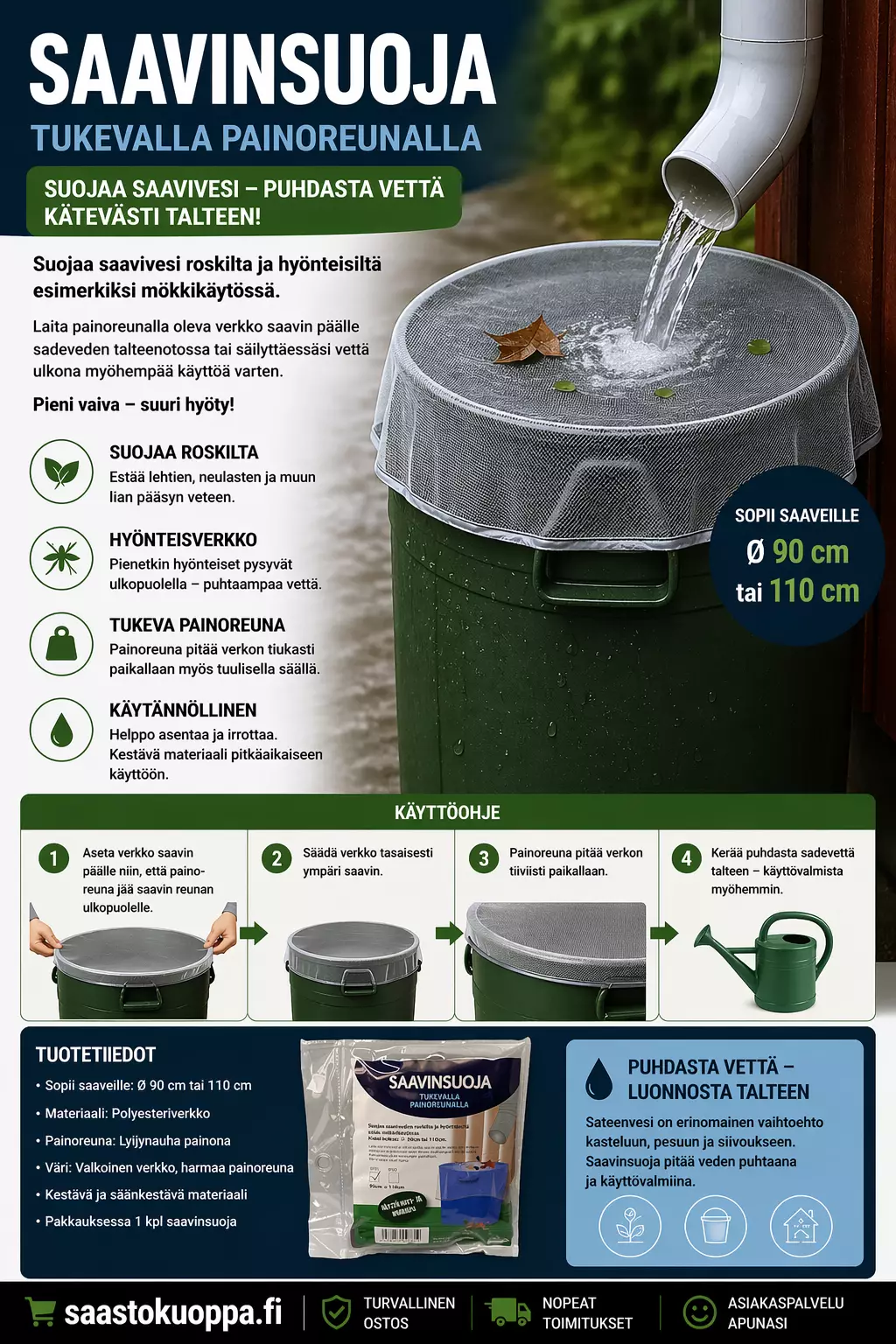 Suojaa saavivesi roskilta ja hyönteisiltä esimerkiksi mökkikäytössä.