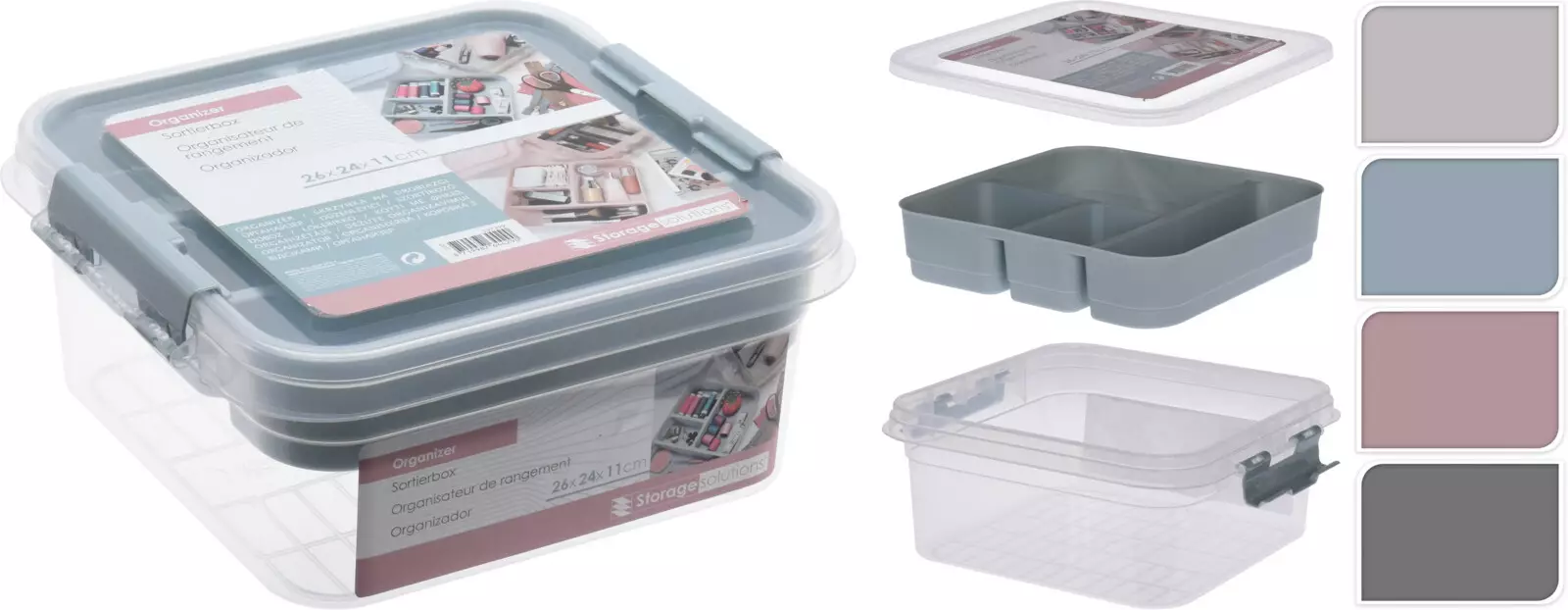 Kansi sulkeutuu tukevasti lukitusklipseillä ja suojaa sisältöä pölyltä. Sisällä oleva lokerollinen järjestelijä helpottaa tavaroiden lajittelua ja tekee niiden löytämisestä nopeaa. Läpinäkyvä rakenne auttaa näkemään sisällön yhdellä silmäyksellä, ja laatikko on helppo pinota säilytyksen tehostamiseksi.