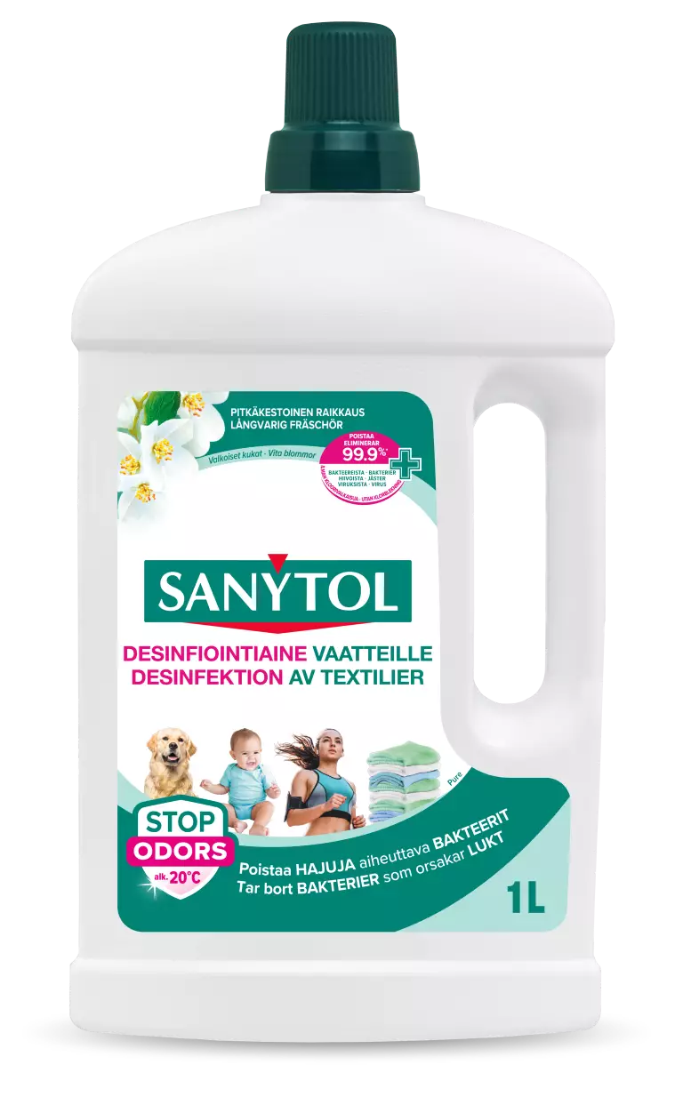 Desinfiointiaine vaatteille. Desinfiointihuuhtelu. Tiiviste, riittää jopa 22 pesuun. Desinfioi valkoiset ja värilliset tekstiilit. Poistaa 99,9 % sienistä, viruksista ja bakteereista.