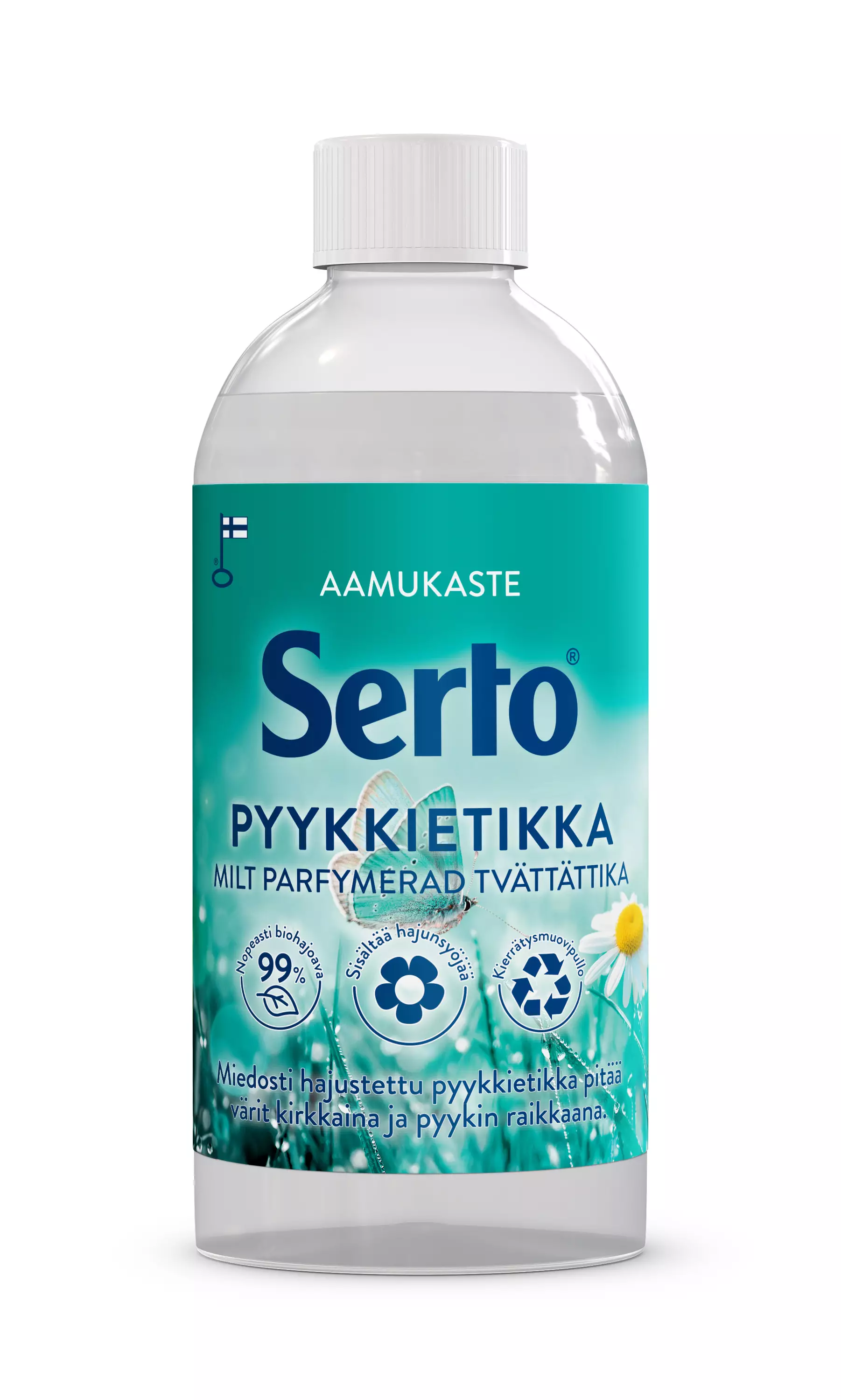 Pyykkietikka on luonnollinen pyykin raikaste, jota käytetään huuhteluaineen tapaan. Kotimainen Serto Aamukaste Pyykkietikka poistaa sähköisyyttä, pehmentää pyykkiä ja kirkastaa tekstiilien värejä. Lisäksi se sisältää hajunsyöjää, joka tehoaa pinttyneimpiinkin hajuihin. Serto pyykkietikat ovat kasvipohjaisista raaka-aineista ja 100% biohajoavia. Ne on pakattu kierrätysmuovipulloihin ja niillä on Avainlippu merkkinä kotimaisesta työstä. Serto Aamukaste Pyykkietikka on Suomen luonnon inspiroima, suomalaiseen tuoksumaailmaan suunniteltu ja miedosti hajustettu.