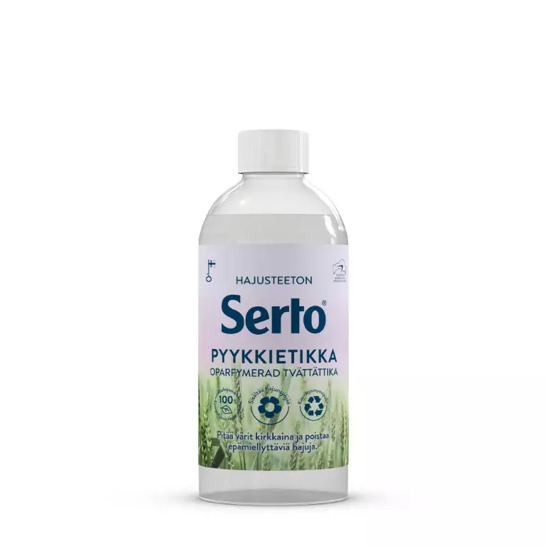 Pyykkietikka on pyykin raikaste, jota käytetään huuhteluaineen tapaan. Serto Hajusteeton Pyykkietikka poistaa sähköisyyttä, pehmentää pyykkiä ja kirkastaa tekstiilien värejä. Lisäksi se sisältää hajunsyöjää, joka tehoaa pinttyneimpiinkin hajuihin. Serto Hajusteeton Pyykkietikka on Allergiatunnuksellinen ja se on pakattu kierrätysmuovipulloon.