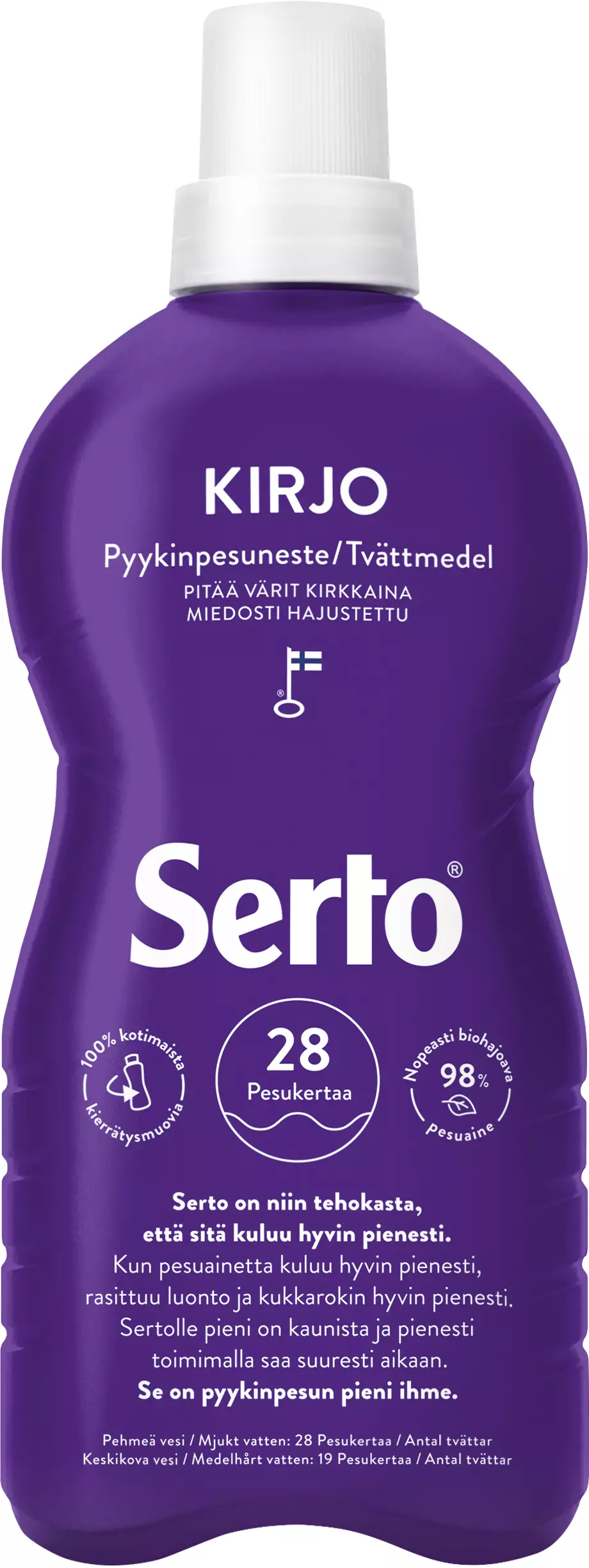 Pitää värit kirkkaina ja puhdistaa tehokkaasti. Serto Kirjo Pyykinpesuneste on suunniteltu erityisesti värillisen pyykin pesuun ja saavuttaa ihanteellisen pesutuloksen jo alhaisissa pesulämpötiloissa. Pyykinpesunesteen värisuoja suojaa tekstiilien värejä pesussa ja pitää ne kirkkaina. Miedosti hajustettu. Ei sovellu villalle ja silkille.