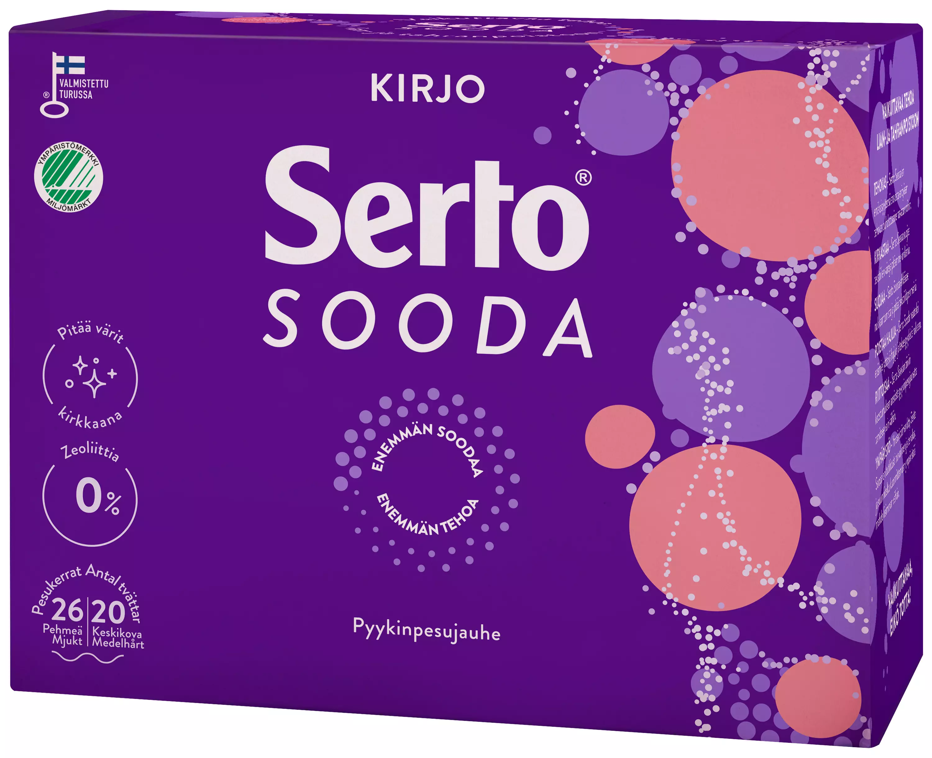 Riittoisa ja tehokas soodapohjainen pyykinpesuaine tuo vaikuttavaa pesutehoa lian- ja tahranpoistoon jo alhaisissakin lämpötiloissa. Joutsenmerkitty Serto Sooda Kirjo Pyykinpesujauhe on tarkoitettu värillisen pyykin pesuun kaikissa lämpötiloissa (40–95 °C), joten se sopii erinomaisesti esim. värillisten lakanoiden pesuun. Tuotteen soodapohjainen ja uudistettu koostumus parantaa pesutehoa, ehkäisee nukkaantumista, ja pitää pyykin miellyttävän pehmeänä. Serto Soodan värisuoja suojaa tekstiilien värejä pesussa, ja yhdessä soodan kanssa pitää värit kirkkaina pesusta toiseen. Pesujauheen sisältämä sooda lisäksi parantaa esimerkiksi rasvatahrojen pesutehoa ja neutraloi hajuja. Tuote ei sisällä zeoliittia eikä fosfonaattia. Miedosti hajustettu. Ei sovellu villalle ja silkille. Valmistettu Suomessa.