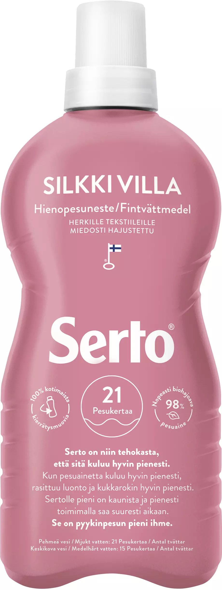 Hellävaraista puhtautta herkille tekstiileille. Serto SilkkiVilla Hienopesuneste on suunniteltu puhdistamaan herkät kuidut hellävaraisesti, mutta tehokkaasti. Hyvin liukenevan ja huuhtoutuvan koostumuksen ansiosta Serto SilkkiVilla puhdistaa vahingoittamatta myös luonnonsilkin, villan ja vauvanpyykin. Miedosti hajustettu.