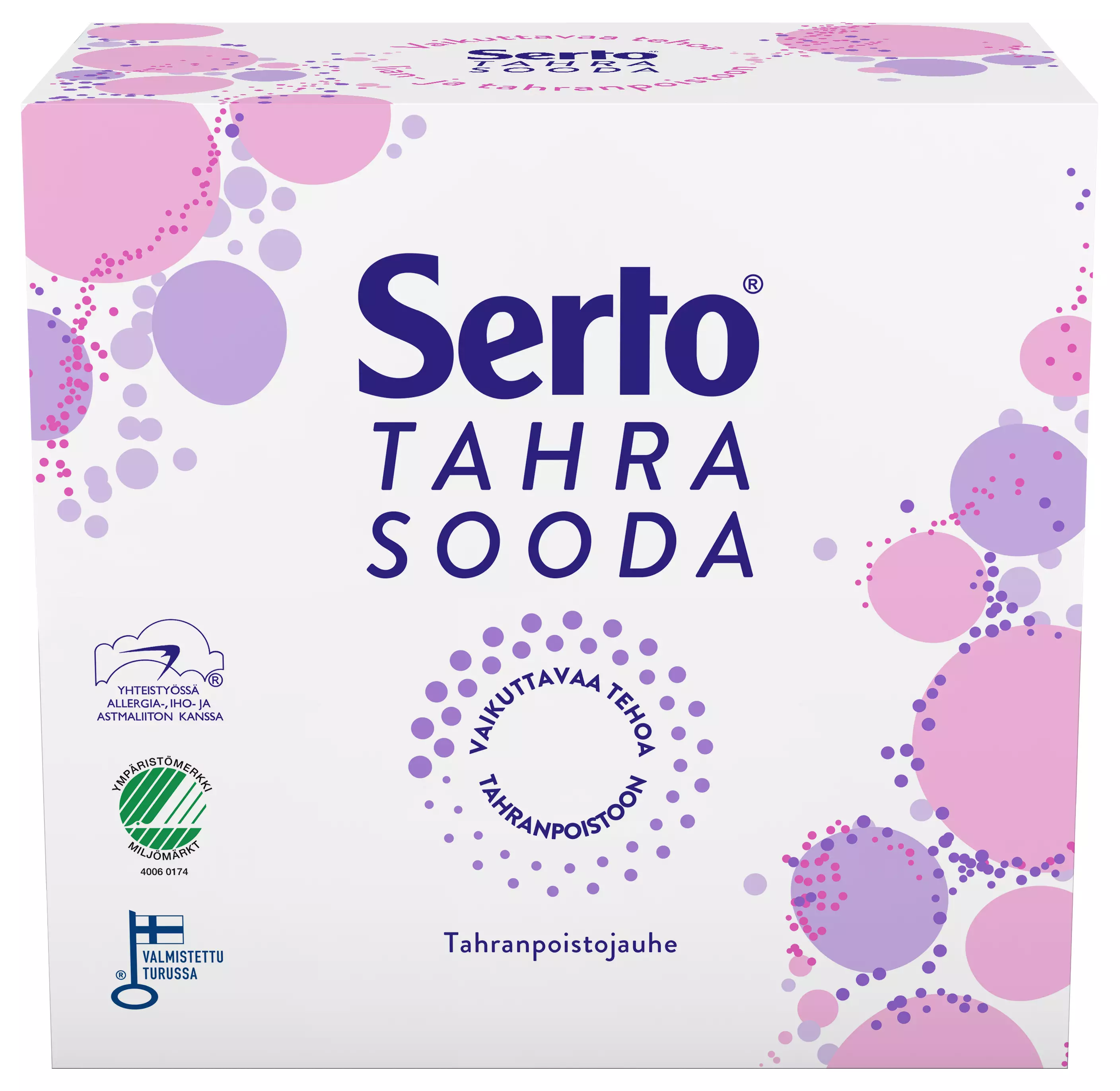 Serto Tahrasooda tuo vaikuttavaa pesutehoa tahranpoistoon! Hajusteeton ja allergiamerkitty Tahrasooda on tehokas soodapohjainen tahranpoistojauhe, joka poistaa tehokkaasti vaikeimmatkin tahrat, kuten kastike-, marja- ja tärkkelystahrat jo 40 °C lämpötilasta alkaen. Tahranpoistoaineen sisältämä sooda neutraloi myös tehokkaasti hajuja ja suojaa tekstiilien värejä pitäen ne kirkkaina. Joutsenmerkitty Serto Tahrasooda on turvallinen ja tehokas tahranpoistojauhe, joka ei sisällä optisia kirkasteita, zeoliittia tai fosfonaattia. Ei sovellu villalle ja silkille. Valmistettu Suomessa.