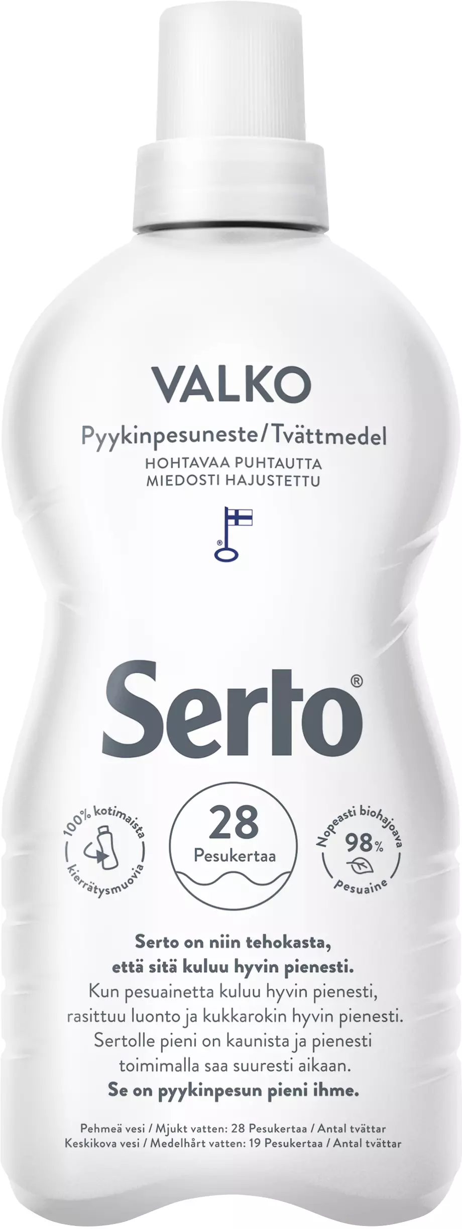 Estää harmaantumista ja säilyttää vaaleat värit hohtavan puhtaina. Serto Valko Pyykinpesuneste on suunniteltu puhdistamaan vaaleat tekstiilit tehokkaasti jo matalissa lämpötiloissa. Pyykinpesunesteen optiset kirkasteet säilyttävät vaaleat tekstiilit hohtavan puhtaina myös usein toistuvassa pesussa. Miedosti hajustettu. Ei sovellu villalle ja silkille.