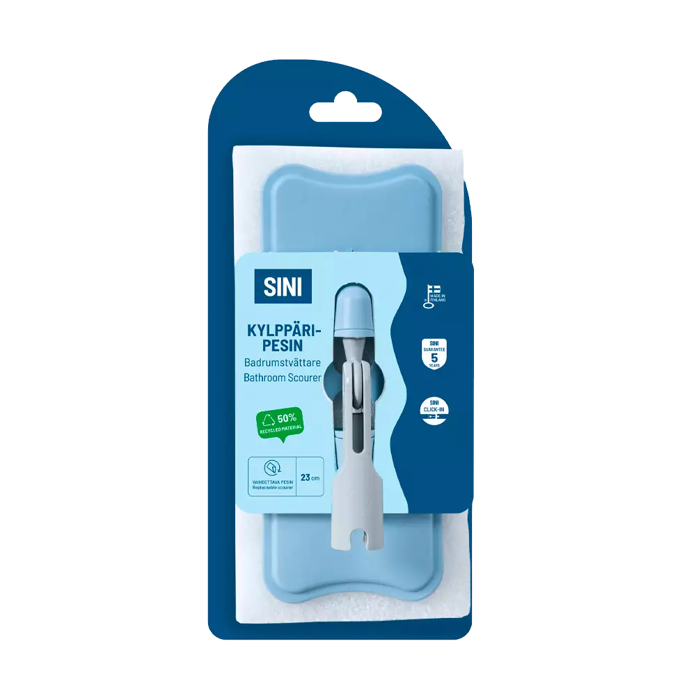 Liitä Kylppäripesin SINI-varteen ja puhdista kylppärin lattiat kumartelematta ja kaakeliseinät katon rajasta asti. Pesimen kuohkea kierrätysmuovinen hankaussieni irrottaa lian tehokkaasti kaikilta vesipesua kestäviltä pinnoilta. Vaihdettava hankaussieni on valmistettu kierrätetystä muovista. Kääntyvän nivelen ansiosta puhdistaa myös kalustejalkojen ympäriltä. Osa SINI-järjestelmää: yksi varsi, monta siivousvälinettä. Valmistettu Kokemäellä. Viiden vuoden SINI-takuu.