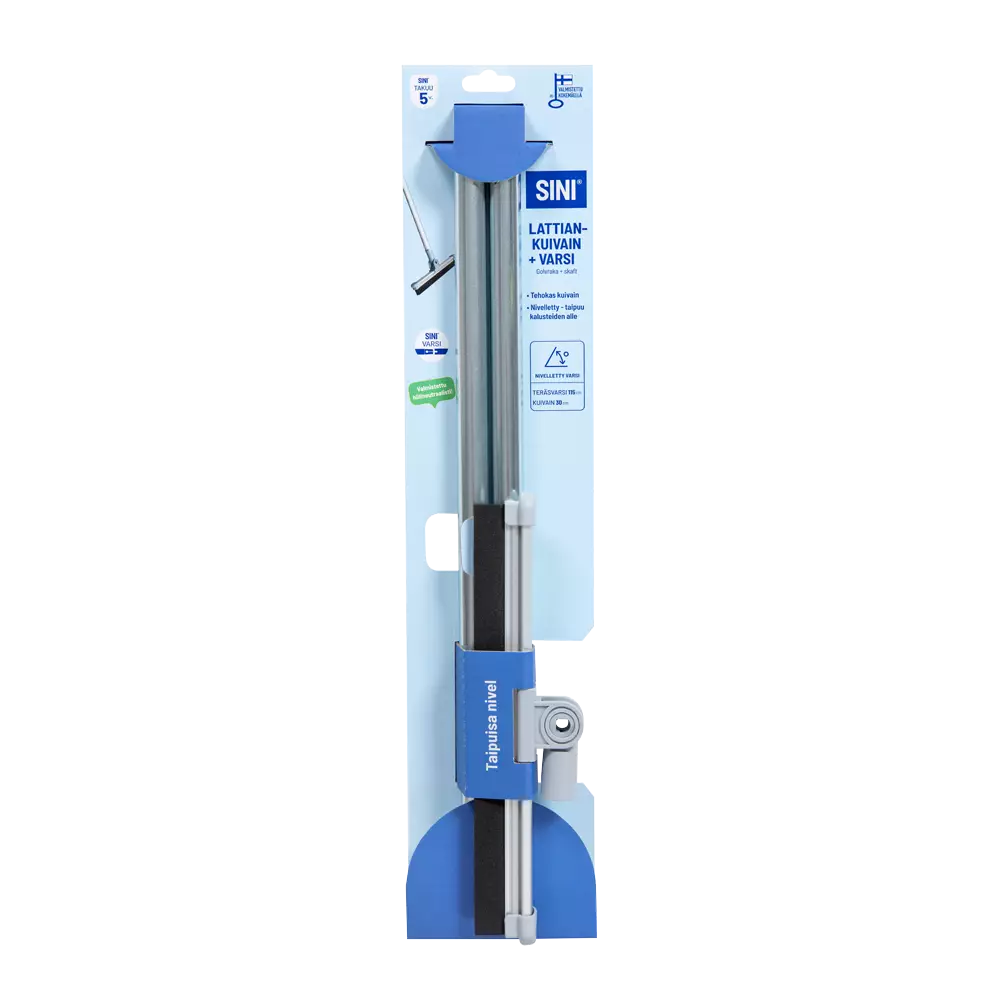Tehokas kuivain. Nivelletty varsi – taipuu kalusteiden alle. Kylpyhuoneen ja muiden kosteiden tilojen lattioiden ja seinien kuivaukseen. Erinomainen myös veneeseen, asuntovaunuun ja muihin ahtaisiin tiloihin. VARREN OSIEN LIITTÄMINEN: Yhdistä varren osat napauttamalla ripustuspäätä lattiaan. ÄLÄ IRROTA OSIA toisistaan yhdistämisen jälkeen.