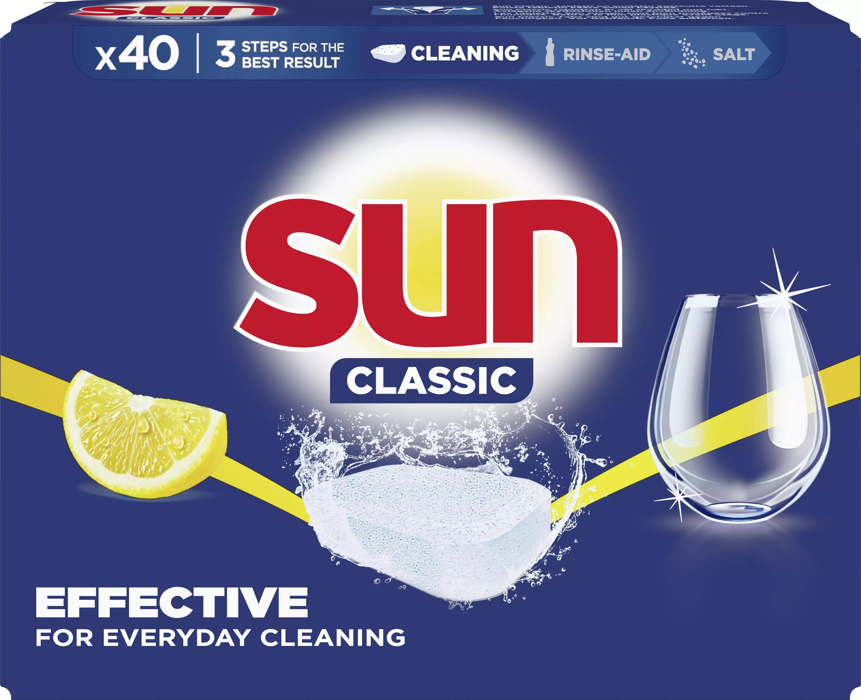 SUN Classic konetiskitabletit pesevät astiat hohtavan puhtaaksi jopa pikapesussa ja ilman esipesua. Täydelliseen lopputulokseen pääset käyttämällä yhdessä SUN huuhtelukirkasteen ja SUN astianpesukonesuolan kanssa.Sun elää innovaatiosta ja haluaa edistää kestävää elämäntapaa. Haluamme että tuotteemme ovat tehokkaita, mutta eivät rasita ympäristöä. Yli 50 vuoden ajan, vuodesta 1965 alkaen, Sun on kehittänyt tuotteitaan entistä paremmiksi, jotta ne toimivat moitteettomasti ja takaavat parhaan pesutuloksen myös alhaisissa pesulämpötiloissa ja lyhytohjelmissa. Näin sinä pystyt säästämään vettä ja energiaa. Innovatiivisten Sun-tuotteiden avulla pidät parempaa huolta astioistasi ja myös pesukoneestasi. Ei siis ole sattumaa, että Sun on tuotemerkki, johon ihmiset luottavat – niin Suomessa kuin maailmalla.