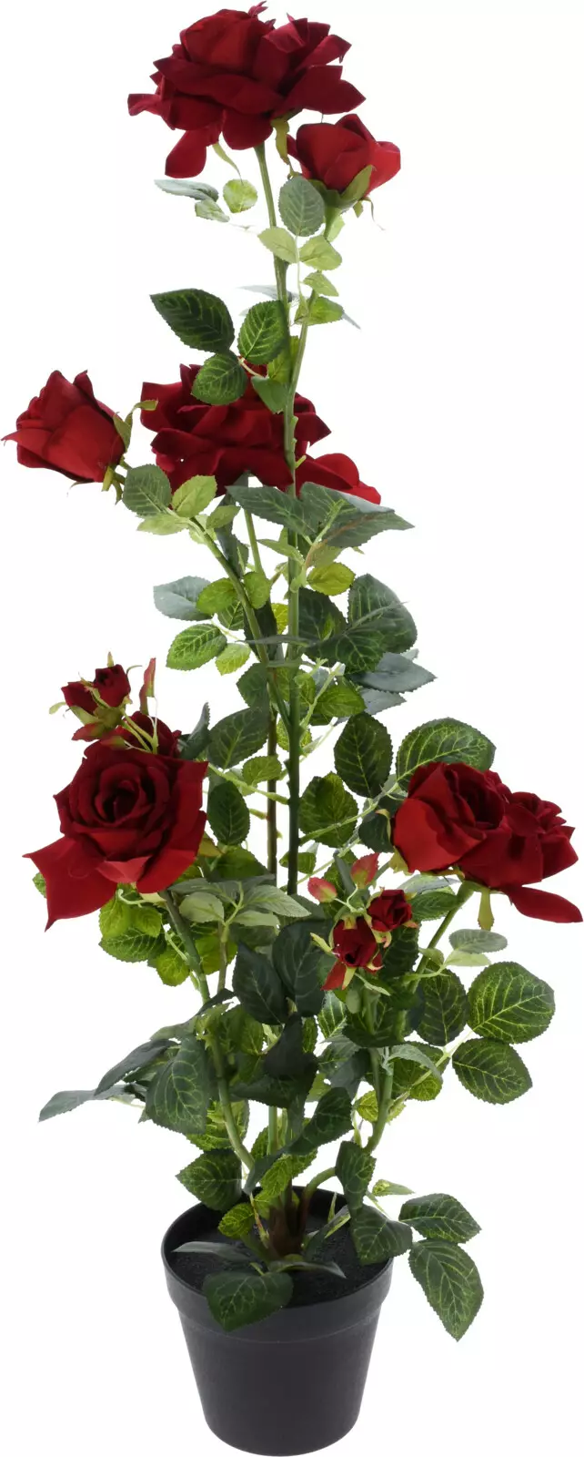 Tekokasvi punainen ruusu ruukussa 95 cmNäyttävä ja romanttinen tekoruusu, joka tuo tilaan klassista kauneutta ilman hoitotarvetta. Korkeus 95 cm, mukana tyylikäs musta ruukku. Sopii upeasti kodin sisustukseen, juhlakoristeeksi tai lahjaksi.