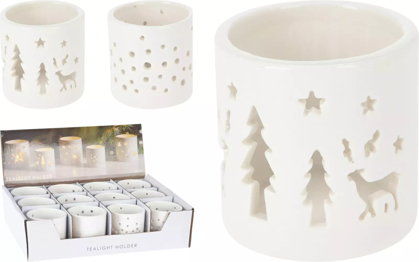 Tuikkukippo jouluteemalla, lajitelmaKaunis valkoinen posliininen tuikkukippo, jossa koristeellisia aukkoja. Kaksi erilaista mallia: pilkkukuvio ja kuusi–poro–tähti -kuvio. Koko 6 x 6 x 6 cm, paino 110 g. Täydellinen joulun tunnelman luomiseen.Voit ilmoittaa mallitoiveesi ostoskorin lisätietokentässä. Mikäli toivomaasi mallia ei ole varastossa, toimitamme tilalle sattumanvaraisen mallin varastotilanteen mukaan.