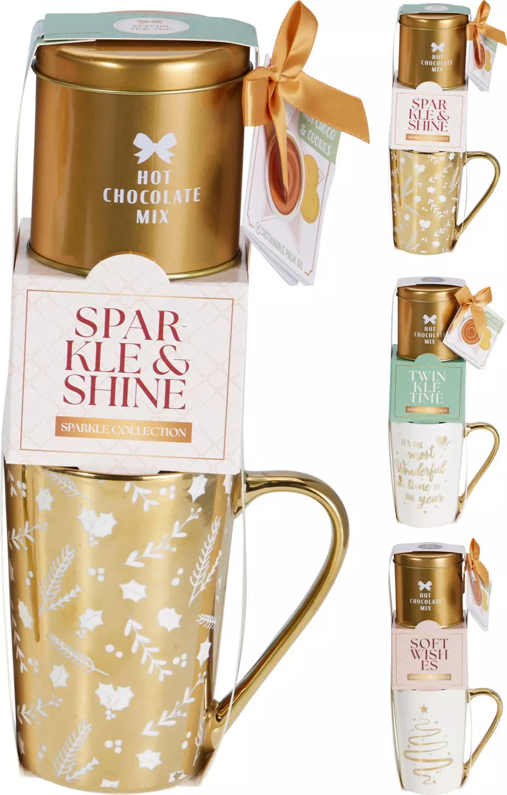 Twinkle-lahjasetti lajitelmaElegantti lahjasetti, joka sisältää kauniin mukin sekä herkullisen kaakaosekoituksen. Tyylikäs ja kimaltava kokonaisuus sopii täydellisesti lahjaksi tai omaan hemmotteluhetkeen. Saatavilla useita eri kuoseja ja tekstejä.Voit ilmoittaa mallitoiveesi ostoskorin lisätietokentässä. Mikäli toivomaasi mallia ei ole varastossa, toimitamme tilalle sattumanvaraisen mallin varastotilanteen mukaan.