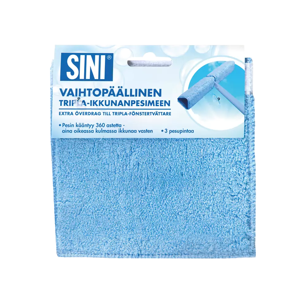 Vaihtopäällinen Tripla-ikkunanpesimeen on helppo laittaa paikoilleen tarrojen avulla. Mikrokuituinen päällinen on konepestävä 60 asteessa.