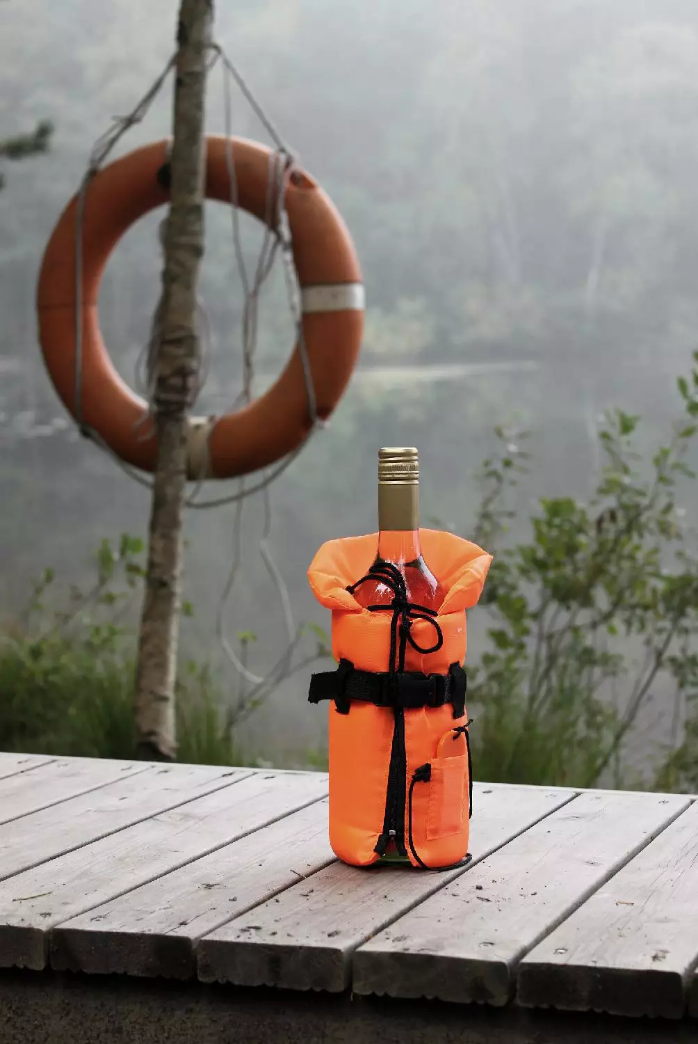 Ahoy, hauska mökkituliainen kaikille viininjuojille. Viinipullon voi laittaa pelastusliiveissä veteen viilentymään.