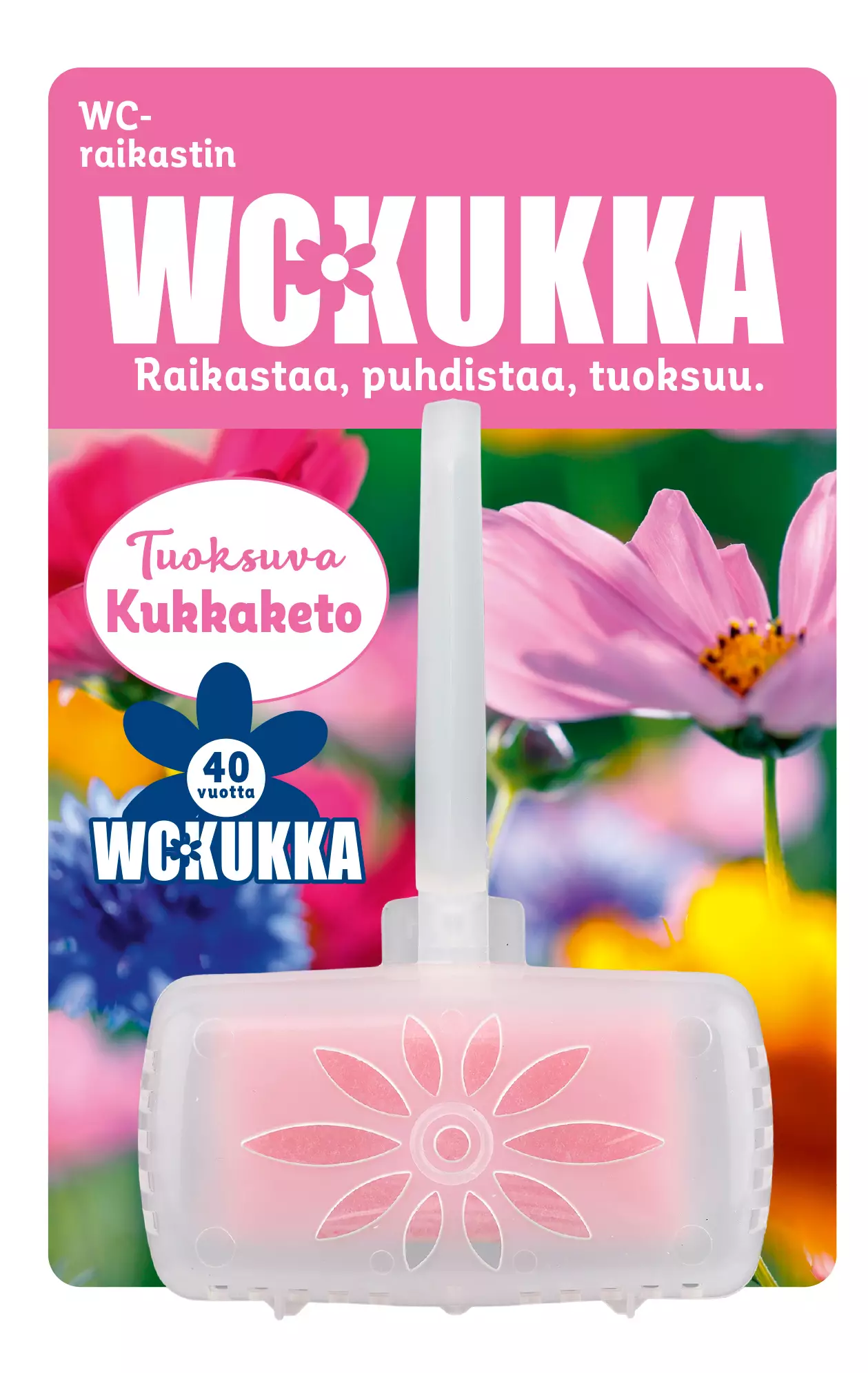 WC Kukka Kukkaketo wc-raikastin puhdistaa wc-altaan ja antaa miedon miellyttävän tuoksun jokaisella huuhtelukerralla. WC-raikastin ennaltaehkäisee kalkin muodostumista auttaen näin WC-allasta pysymään puhtaana pidempään.