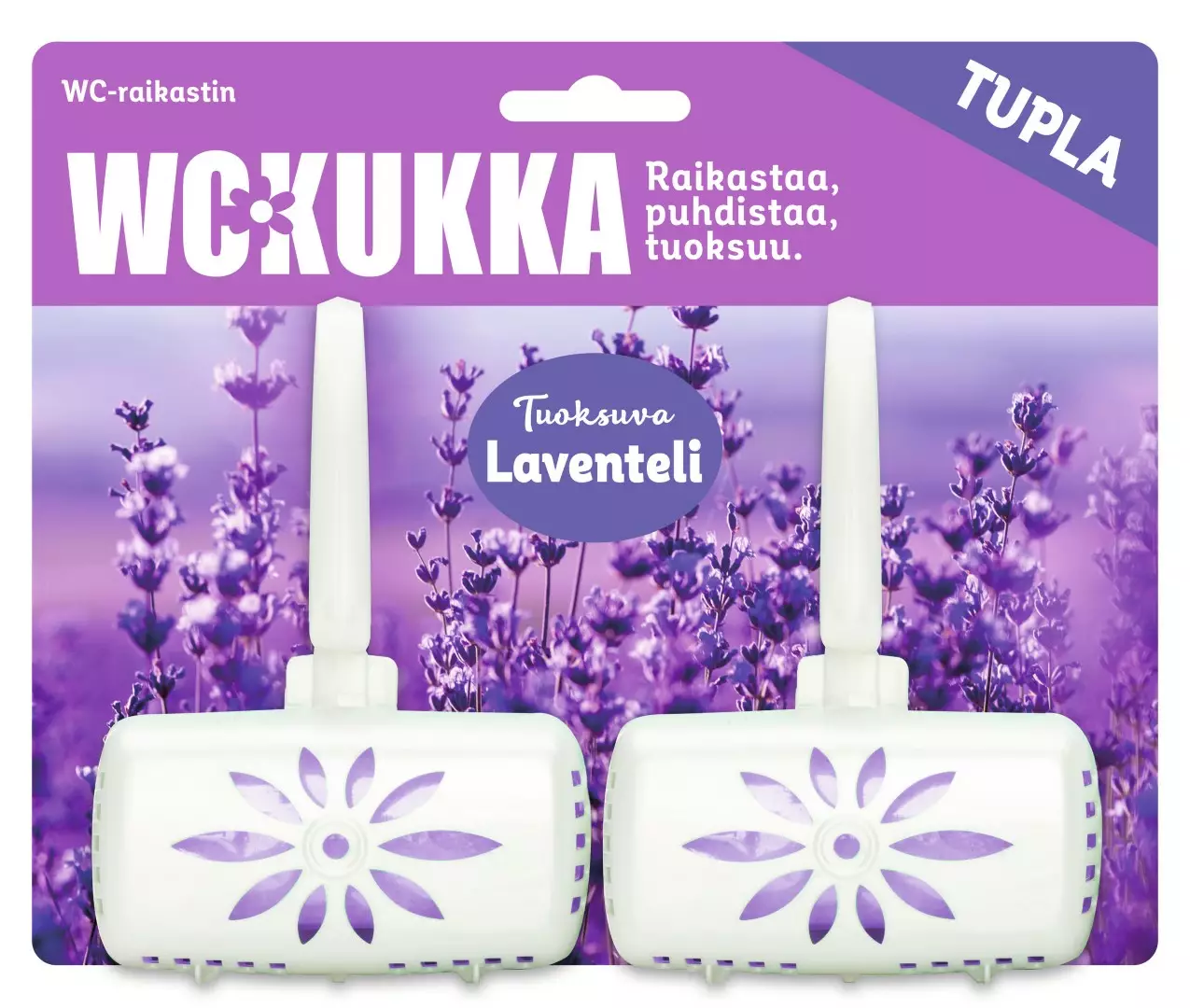 WC Kukka Laventeli wc-raikastin puhdistaa wc-altaan ja antaa raikkaan tuoksun jokaisella huuhtelukerralla. WC-raikastin ennaltaehkäisee kalkin muodostumista ja poistaa epämiellyttäviä hajuja. Pehmeä ja rauhoittava laventelintuoksu. Kätevä tuplapakkaus kestää kotikäytössä useita viikkoja.