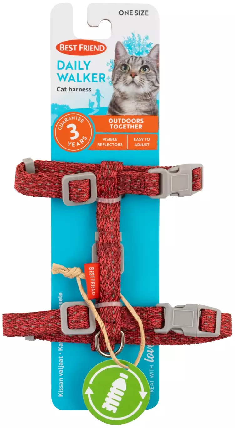 Best Friend Daily Walker Cat Harness on perinteinen naruvaljas kissoille ja se sopiikin hyvin kaikkiin päivittäisiin ulkoiluhetkiin. Valjaiden erinomainen säädettävyys sekä pääntiellä että rinnanympäryksessä takaavat hyvän istuvuuden useimmille kissoille. Daily Walker Cat Harness on helppo pukea ja se on mukava käytössä kissalle. Valjaan nauhoissa on tehokkaat heijastimet, jotka lisäävät näkyvyyttä ja turvallisuutta pimeällä. Tämä kissan valjas on myös ympäristöystävällinen valinta, sillä se on valmistettu GRS-sertifioidusta, kierrätetystä 100 % PET-materiaalista. Parhaan kaverin mukana kaikissa seikkailuissa! Värilajitelma. Treat with love.