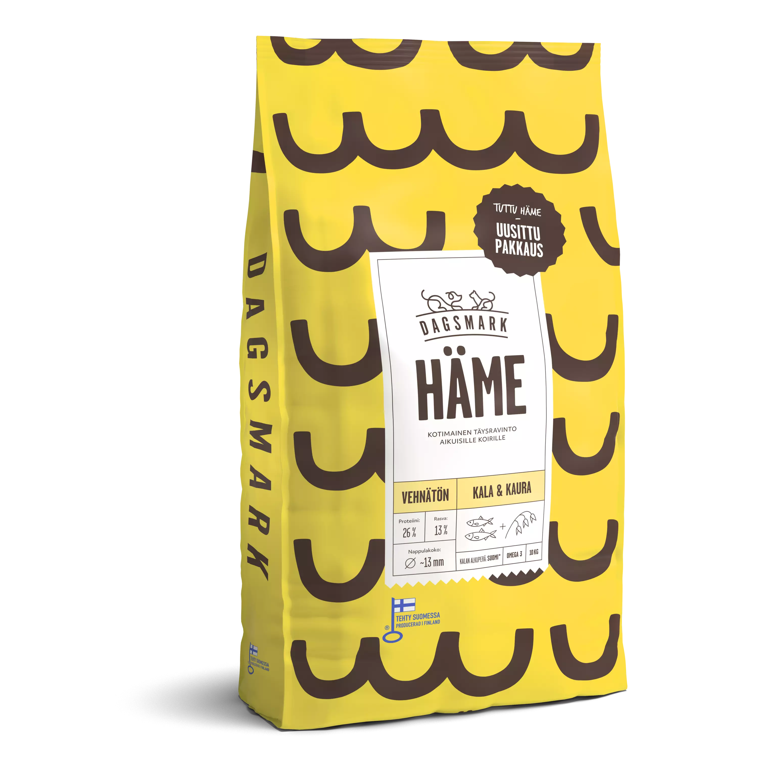 - Kanaton- Vehnätön- Villiä Itämeren kalaa- Gluteenitonta ja vatsaystävällistä kauraa- 13 % rasvaa, 26 % proteiinia- Valmistettu SuomessaVehnätön täysravinto aikuiselle koiralle.Dagsmark HÄME on villiä Itämeren kalaa ja kauraa sisältävä kuivaruoka. Itämeren silakka on ekologinen ja ravinnerikas raaka-aine, joka on hyvä lähde sydänystävällisille EPA- ja DHA-rasvahapoille, jotka tukevat nivelien, sydämen, aivojen ja silmien luonnollista hyvinvointia. Kotimainen kaura on luontaisesti gluteenitonta ja tunnetaan vatsaa hellivistä kuiduistaan, ja se sopiikin myös monelle herkkävatsaiselle koiralle. Kotimainen camelinaöljy on hyvä omega-3- ja 6-rasvahappojen lähde, jotka ravitsevat koiran turkkia ja ihoa.Dagsmark HÄME tukee koirasi hyvinvointia ja sisältää kaikki koirasi tarvitsemat kivennäisaineet sekä vitamiinit. Kuivaruoka ei sisällä vehnää, kanaa, kananrasvaa, lohiöljyä, soijaa, maissia eikä säilöntä-, aromi- tai väriaineita.Dagsmark haluaa täyttää tassukansan ruokakupit mahdollisimman vastuullisesti Suomessa tuotetulla lemmikinruoalla.HUOM! Resepti uudistuu 2025 aikana. Tarkista tuotteen ainesosat myös myyntipakkauksesta.
