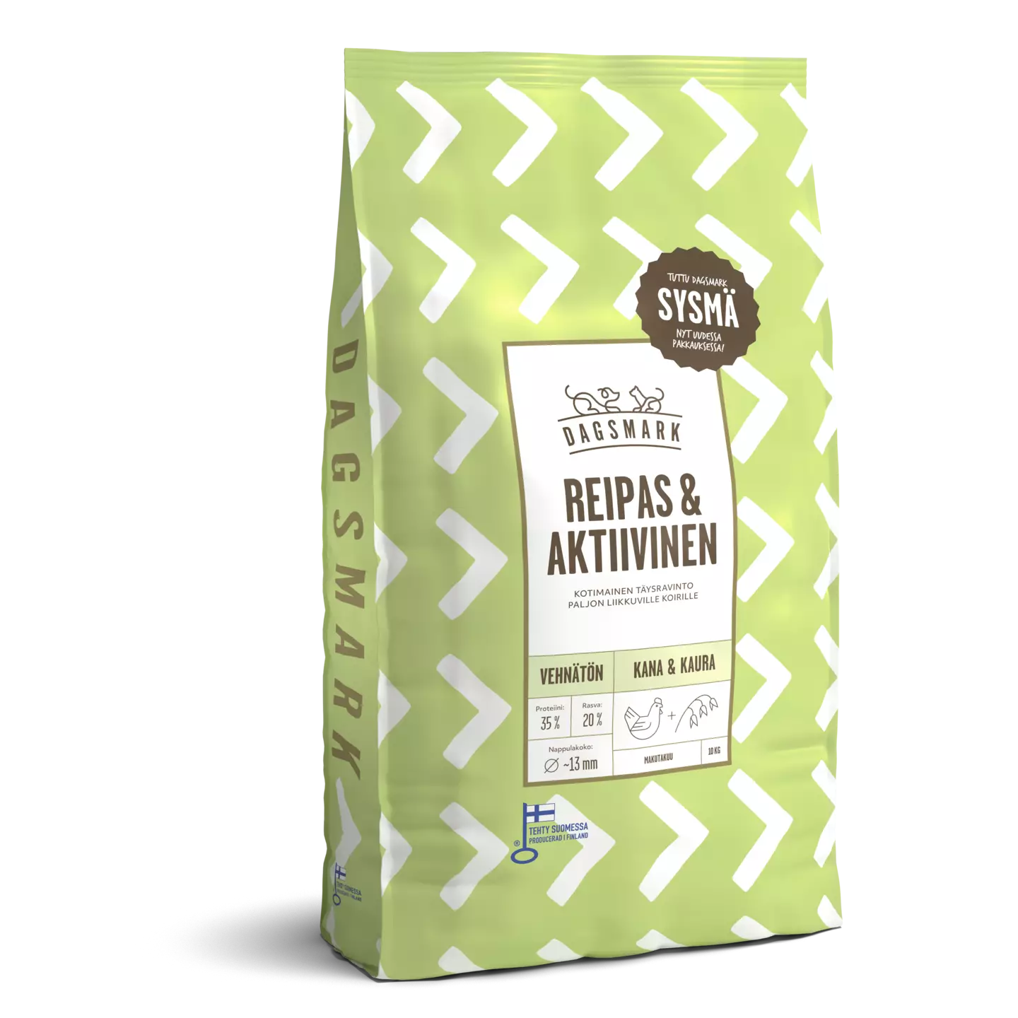 Dagsmark Reipas Aktiivinen on kotimaista kanaa ja kauraa sisältävä kuivaruoka. Kuivaruoka sisältää runsaasti proteiinia 35 % ja 20 % rasvaa, joten soveltuu optimaalisesti kasvaneeseen energiantarpeeseen treeni-, urheilu- ja metsästyskoirille. Sisältää suoliston normaalia toimintaa edistäviä MOS- ja FOS-prebiootteja, jotka tukevat luontaisesti hyvien suolistobakteerien kasvua ja vastustuskykyä. Mukana myös glukosamiinia ja kondroitiinisulfaattia tukemassa aktiivisen koiran nivelten luonnollista hyvinvointia. Merileväöljy on hyvä omega-3- ja 6-rasvahappojen lähde, jotka ravitsevat koiran turkkia ja ihoa.