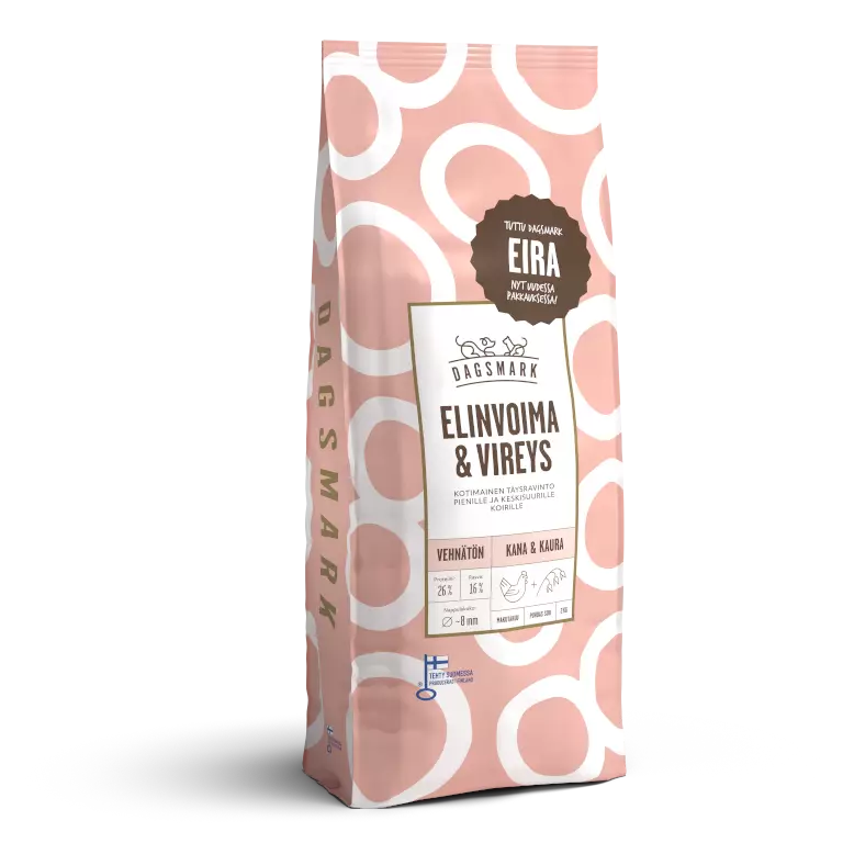- Vehnätön- Kotimaista kanaa- Gluteenitonta ja vatsaystävällistä kauraa- Rasvaa 16 %, proteiinia 26 %- Pienempi nappula- Dental-ominaisuus- Nivelravinteita- Valmistettu SuomessaVehnätön täysravinto pienelle ja keskisuurelle aikuiselle koiralle.Dagsmark Elinvoima Vireys vehnätön kana on kotimaista kanaa ja kauraa sisältävä kuivaruoka. Pienempi maistuva nappula takaa riittävän energian saannin nirsoimmillekin koirille. Reseptissä on huomioitu pitkäikäisten koirien hampaita, sydäntä ja niveliä. Sisältää C-vitamiinia, tauriinia, L-karnitiinia ja natriumheksametafosfaattia, joka tukee suun luonnollista puhtautta. Mukana myös glukosamiini ja kondroitiinisulfaattia tukemassa nivelten luonnollista hyvinvointia. Sisältää suoliston normaalia toimintaa edistävät MOS- ja FOS-prebiootit, jotka tukevat luontaisesti hyvien suolistobakteerien kasvua ja vastustuskykyä. Merileväöljy on hyvä omega-3- ja -6-rasvahappojen lähde, jotka ravitsevat koiran turkkia ja ihoa.Dagsmark Elinvoima Vireys vehnätön kana tukee koirasi hyvinvointia ja sisältää kaikki koirasi tarvitsemat kivennäisaineet sekä vitamiinit. Kuivaruoka ei sisällä vehnää, soijaa, maissia eikä säilöntä-, aromi- tai väriaineita.Dagsmark haluaa täyttää tassukansan ruokakupit mahdollisimman vastuullisesti Suomessa tuotetulla lemmikinruoalla.HUOM! Resepti uudistuu 2025 aikana. Tarkista tuotteen ainesosat myös myyntipakkauksesta.