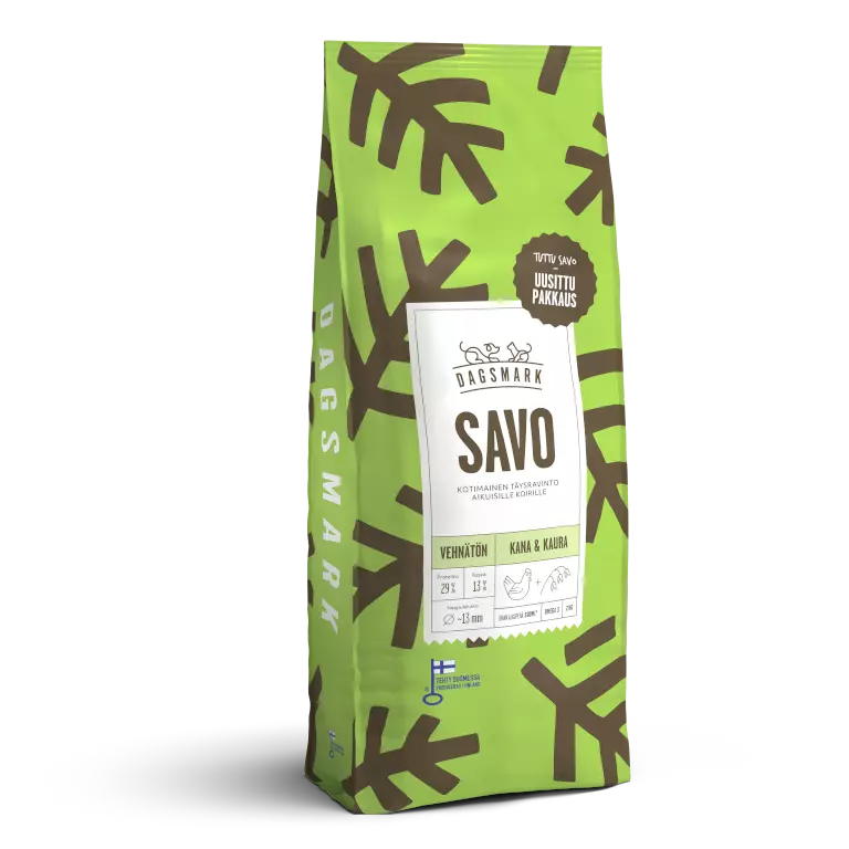 - Vehnätön- Kotimaista kanaa- Gluteenitonta ja vatsaystävällistä kauraa- Rasvaa 13 %, proteiinia 29 %- Valmistettu SuomessaVehnätön täysravinto aikuiselle koiralle.Dagsmark SAVO on kotimaista kanaa ja kauraa sisältävä kuivaruoka. Kotimainen kaura on luontaisesti gluteenitonta ja tunnetaan vatsaa hellivistä kuiduistaan, ja se sopiikin myös monelle herkkävatsaiselle koiralle. Kotimainen camelinaöljy on hyvä omega-3- ja 6-rasvahappojen lähde, jotka ravitsevat koiran turkkia ja ihoa.Dagsmark SAVO tukee koirasi hyvinvointia ja sisältää kaikki koirasi tarvitsemat kivennäisaineet sekä vitamiinit. Kuivaruoka ei sisällä vehnää, soijaa, maissia eikä säilöntä-, aromi- tai väriaineita.Dagsmark haluaa täyttää tassukansan ruokakupit mahdollisimman vastuullisesti Suomessa tuotetulla lemmikinruoalla.HUOM! Resepti uudistuu 2025 aikana. Tarkista tuotteen ainesosat myös myyntipakkauksesta.