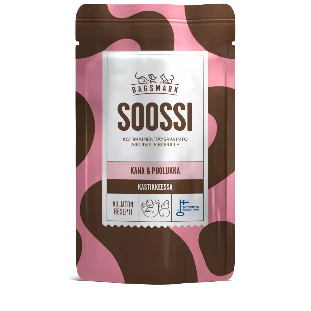 - Täysravinto- Kotimaista kanaa- Viljaton- Valmistettu SuomessaKotimainen ja viljaton koiran märkäruoka Dagsmark SOOSSI kana & puolukka kastikkeessa on tehty lajinmukaiseen hyvinvointiin. Maukkaan reseptin pääraaka-aineena on suomalainen ilman antibiootteja kasvatettu kana. Tämä täysravinto sisältää kaikki koirasi tarvitsemat kivennäisaineet sekä vitamiinit, ja se sopii käytettäväksi pääasiallisena ravintona tai herkullisena lisukkeena. Kaikki Dagsmarkin märkäruoat valmistetaan ylpeydellä Mellilässä ilman vehnää, soijaa, lisättyä sokeria, säilöntä- tai väriaineita.