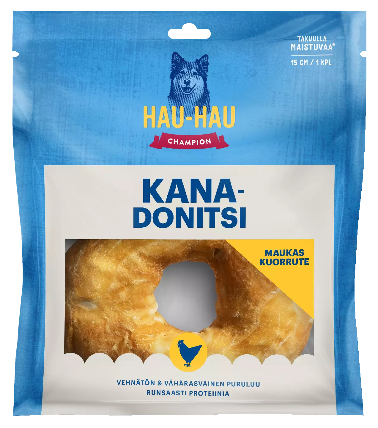 - Herkullinen kanakuorrute- Runsaasti proteiinia- Nirsoille koirille- Puuhaa leuoille ja hampaille pitkäksi aikaa- Vehnätön ja lihaisa Makoisalla kanalla kuorrutettu, naudannahasta valmistettu Hau-Hau Champion Kanadonitsi on oivallinen puruluu koirasi herkkuhetkiin. Pureskelu on koiralle luontaista ja mieluisaa työtä, joka myös edistää koiran hampaiden ja ienten hyvinvointia. Donitsin muoto antaa koirallesi lisähaastetta ja aktivointia pitkäksikin aikaa. Saatavilla kaksi puruluukokoa eri kokoisten koirien tarpeisiin. Hau-Hau Championin lihaa sisältävät puruluut ovat herkullinen tapa tarjota koirallesi virikkeitä. Pureskelu on koiralle lajityypillistä toimintaa, ja luiden syöminen edistää suun hyvinvointia tarjoten mekaanista hampaidenpuhdistusta. Fileillä kuorrutetut puruluut maistuvat nirsollekin koiralle. Kanadonitsit sisältävät runsaasti proteiinia, joten tarjoa niitä koiralle kohtuudella. Valvo aina koiraasi sen syödessä puruluita.