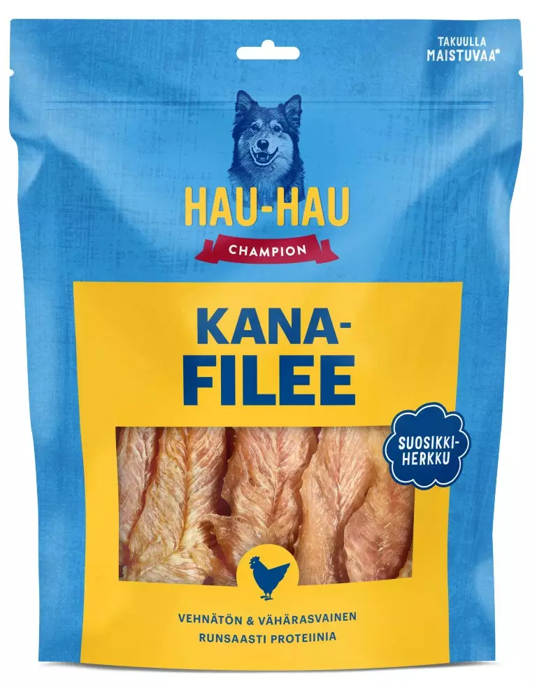 - Vehnätön ja vähärasvainen- Runsaasti proteiinia- Klassikkoherkku- Valmistusmaa: KiinaHerkullinen Hau-Hau Champion Kanafilee on hemmottelua joka puraisulla. Aidosta kananrinnasta valmistettu makupala on runsaasti proteiinia sisältävä mehevä herkku. Luontaisesti vähärasvainen kanafilee sopii myös helposti lihoville koirille.Kanafileet sopivat niin koirakaverin herkutteluhetkiin kuin mukaan harrastuksiinkin. Vähärasvaiset koiran makupalat eivät sisällä lisättyä sokeria tai vehnää. Kanafileet ovat kuivattua lihaa, joten pidäthän huolen, että koirallasi on aina raikasta vettä saatavilla. Herkut sisältävät runsaasti proteiinia, joten tarjoa niitä koiralle kohtuudella. Jos etsit kotimaista kanaherkkua koirallesi, kokeile vaihtoehtoisesti Ikaalisissa valmistettua Hau-Haun kuivattua kanan siipiherkkua. Hau-Haun runsaasta herkkuvalikoimasta löydät taatusti koirasi suosikin!