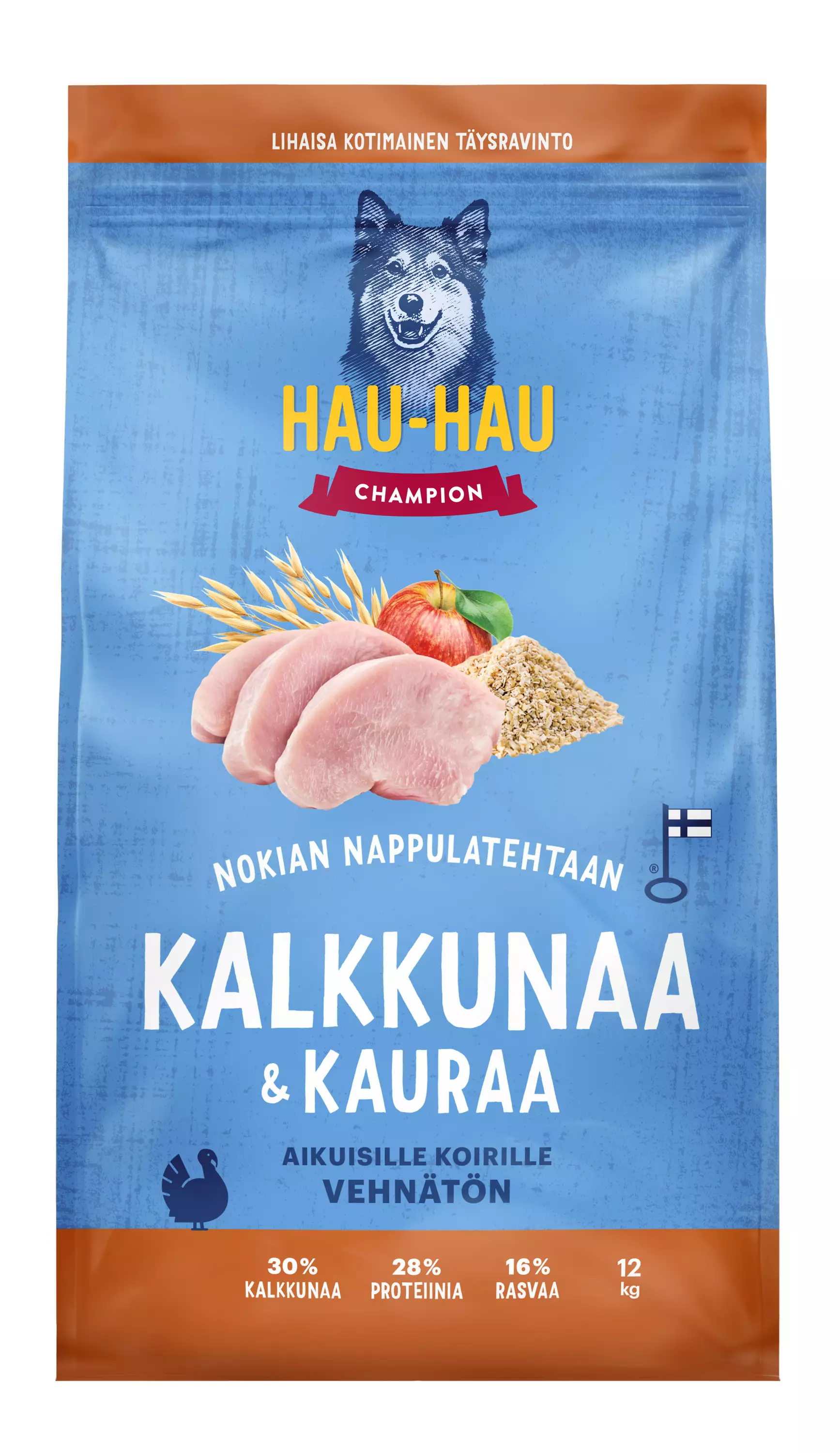 Hau-Hau Champion Nokian Nappulatehtaan Kalkkunaa & kauraa täysravinto aikuisille koirille 12 kg