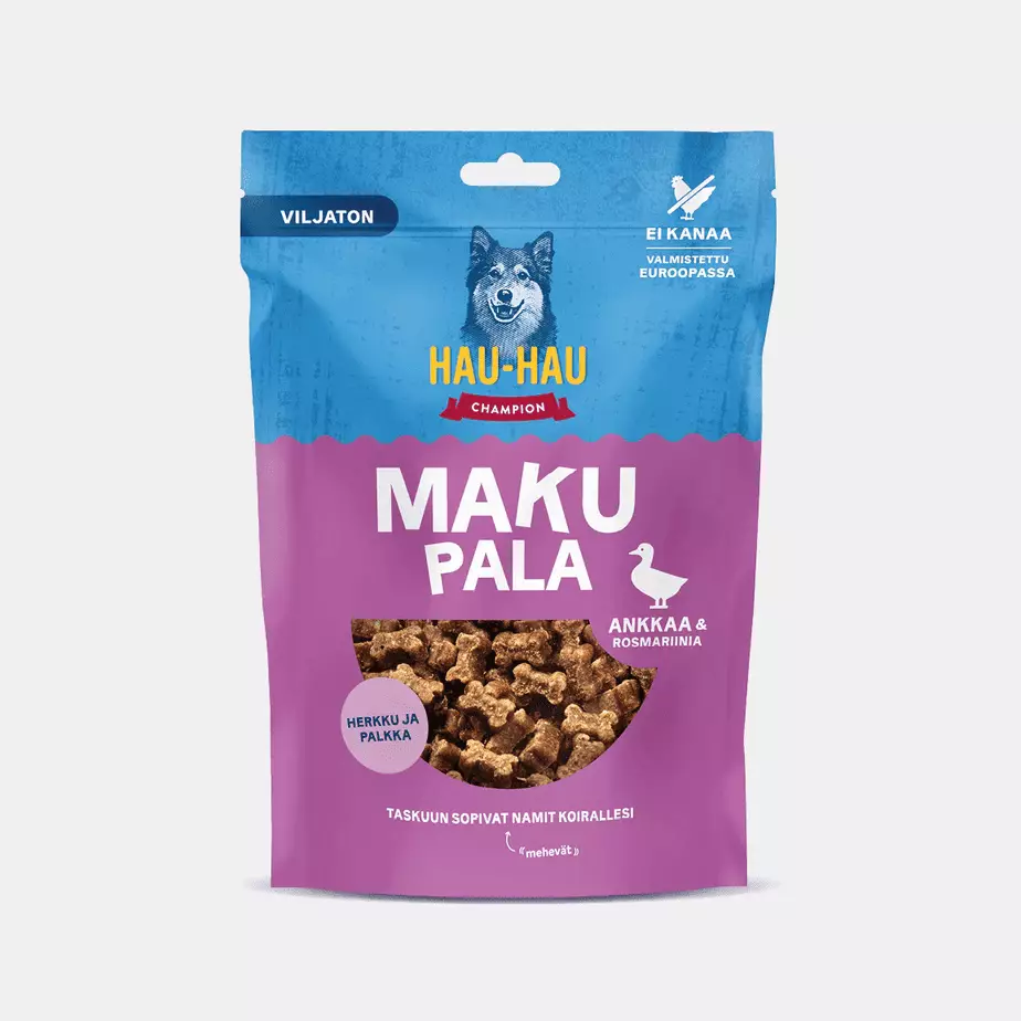 - Viljaton- Kanaton- Valmistettu Euroopassa Hau-Hau Champion Viljaton Makupala ankka-rosmariini on maukas ankanlihasta valmistettu herkku, joka sopii erinomaisesti koiran motivointiin niin kotona, lenkillä kuin treeneissäkin. Nämä maukkaat, helposti paloiteltavat namit eivät sisällä lainkaan viljaa, kanaa, soijaa tai sokeria, joten ne ovat hyvä vaihtoehto myös herkkävatsaisille koirille. Reseptiin lisätty rosmariini puolestaan on luonnollinen antioksidanttien lähde. Me uskomme, että ansaittu makupala on jokakoiranoikeus. Siksi löydät tuotteemme sopivaan hintaan sieltä, mistä ostat ruokaa muillekin perheenjäsenillesi.