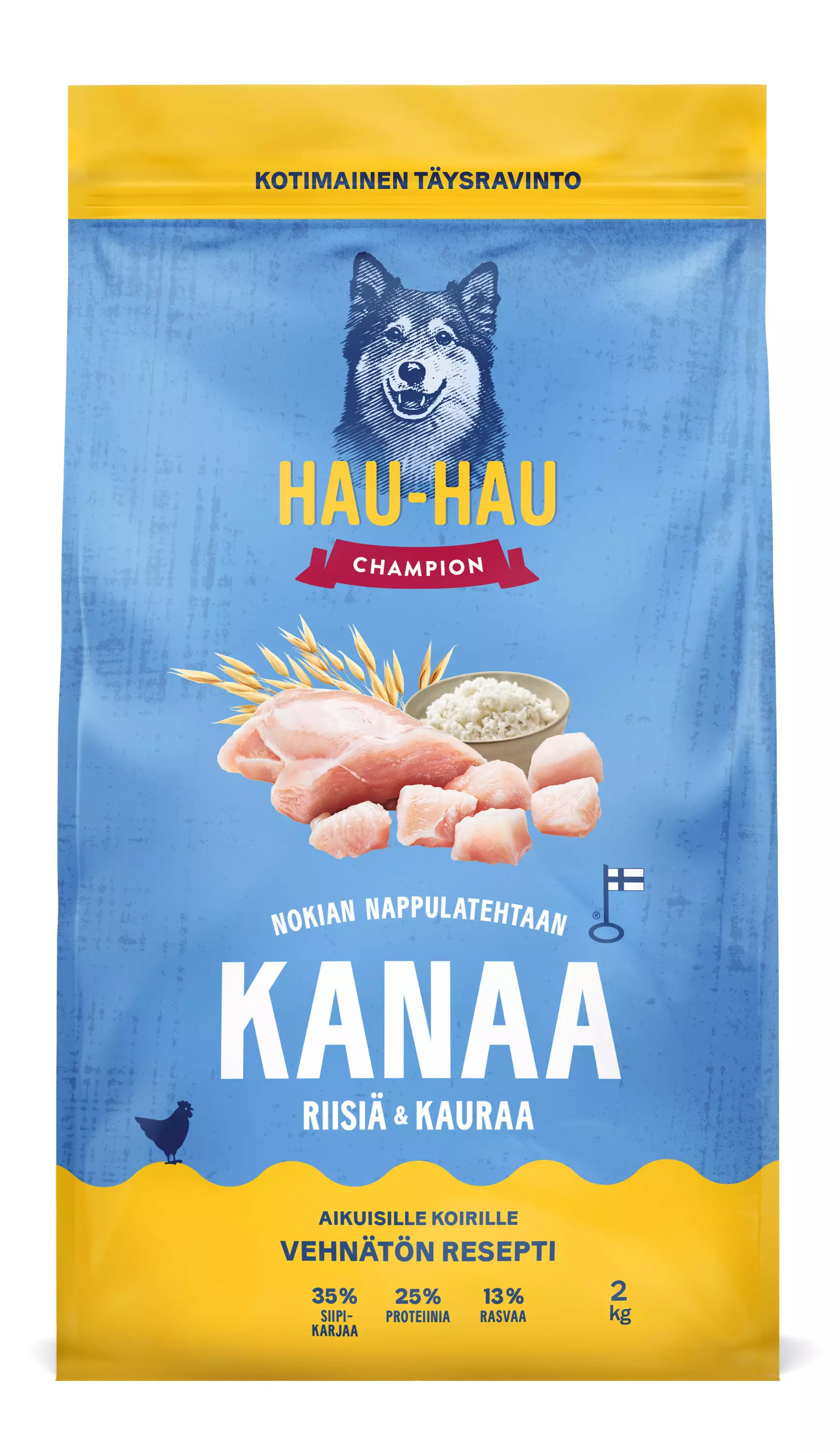 - Maistuva ja lihaisa resepti- Valmistettu Suomessa Nokialla- 100 % kotimaista kanaa ja kauraa- Ei vehnää, maissia tai soijaa- Hyvää vatsalle Etsitkö maistuvaa kotimaista kuivaruokaa koiralle? Hau-Hau Champion Kanaa, riisiä & kauraa on vehnätön koiran kuivaruoka, josta koira saa kaikki sen tarvitsemat ravintoaineet sopivassa suhteessa. Tämä lihaisa koiran täysravinto sisältää 35 % kotimaista siipikarjaa ja kaikkiaan 25 % proteiinia, josta 75 % on eläinperäistä. Kotimainen kana on tämän koiranruoan ensisijainen eläinproteiinin ja -rasvan lähde. Raaka-aineen saatavuuden mukaan ruoka saattaa sisältää kanan lisäksi vatsaystävällistä, kotimaista kalkkunaa.Kanaa, riisiä & kauraa -kuivaruoka on valmistettu Nokian Nappulatehtaalla Pirkanmaalla. Käytämme nappuloissa vatsaa hellivää kotimaista kauraa ja huolellisesti kypsennettyä riisiä sekä omega-rasvahappoja sisältävää, suomalaista camelinaöljyä. Ripaus kuorittua keltaista hernettä pitää herkullisen nappulan muodossaan. FOS- ja MOS-prebiootit auttavat edistämään koiran suoliston toimintaa ja tukevat vastustuskykyä. Tämän kuivaruoan kotimaisuusaste on jopa 82 %.