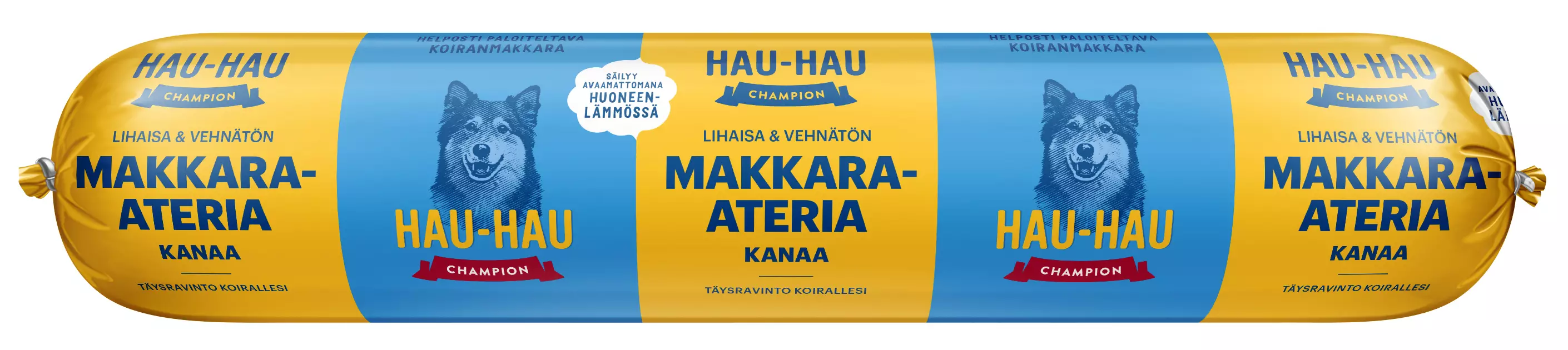 - Vehnätön ja lihaisa- Helposti paloiteltava koostumus- Säilyy avaamattomana huoneenlämmössä- Ei väri- tai säilöntäaineita- Tarjoa sellaisenaan tai lisukkeena kuivaruoan ohessa- Valmistettu Euroopassa Hau-Hau Champion Makkara-ateria kanaa on vehnätön ja lihaisa täysravinto kaikille koirille. Huolella suunniteltu resepti sisältää kaikki koirasi tarvitsemat ravintoaineet. Muotonsa pitävä makkara sopii hyvin ateriaksi sellaisenaan, kuivaruoan lisukkeeksi tai makupaloiksi harrastuksiin. Koiranmakkara säilyy avaamattomana huoneenlämmössä, joten se on mukava ottaa mukaan matkalle tai metsäretkelle.