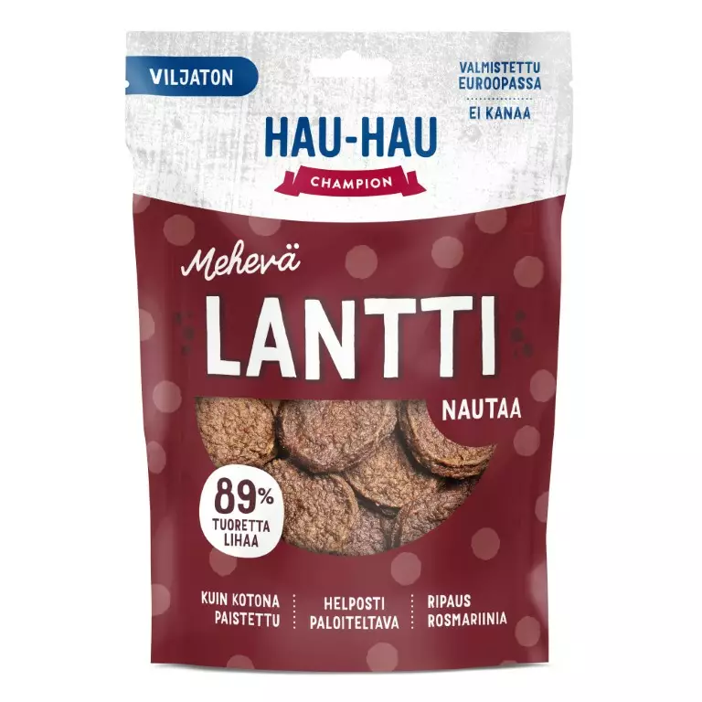 - Viljaton ja kanaton koiranherkku- 89 % tuoretta lihaa- Ei viljaa, soijaa tai sokeria- Helppo paloitella murustelematta- Valmistettu Virossa, suunniteltu Suomessa Näillä herkuilla valloitat koiraystäväsi sydämen! Hau-Hau Championin Mehevät Lantit on pyöritelty lihaisasta taikinasta, jossa on käytetty proteiininlähteenä ainoastaan naudanlihaa. Tuloksena syntyi kuin kotona paistettu makupala, jonka voit paloitella helposti pienemmäksi murustelematta. Hau-Haun omalla tehtaalla Virossa leivotut herkut eivät sisällä lainkaan viljaa, soijaa tai sokeria. Tuoreesta raakalihaseoksesta muotoillut lantit kypsennetään pitkään matalassa lämpötilassa, mikä takaa niiden erinomaisen maistuvuuden. Reseptiin lisätty rosmariini sisältää koiran hyvinvointia tukevia antioksidantteja.