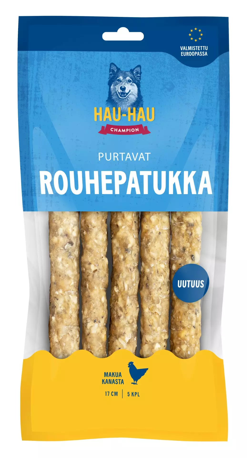 - Murea puruluu- Sopii pienelle ja keskivahvalle puruvoimalle- Viljaton ja vähärasvainen- Valmistettu Euroopassa Hau-Hau Champion Purtavat Rouhepatukka Kana on vähärasvainen ja viljaton puruluu, johon on lisätty ripaus maukasta kanaa. Rouhepatukka sopii erinomaisesti keskivahvalle ja pienelle puruvoimalle. Puruluiden pureskelu auttaa puhdistamaan koiran hampaita mekaanisesti. Puruluun kaluaminen voi olla myös oiva apu koiran stressin lievittämiseen tai vilkkaan koiran rauhoittamiseen. Purtavat on valmistettu Hau-Haun omalla tehtaalla Euroopassa.