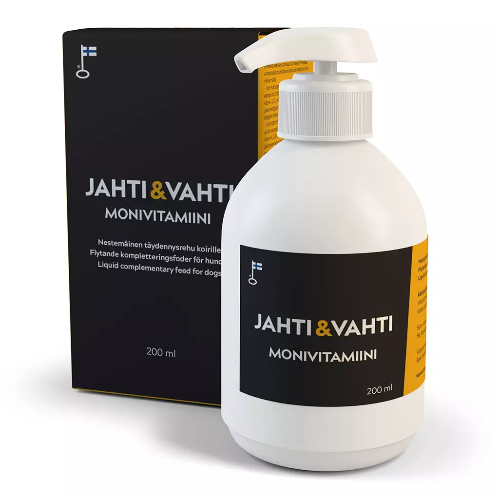 Jahti & Vahti Monivitamiini on vesipohjainen, ei sisällä maku- eikä väriaineita. Suositellaan erityisesti raakaruokinnan täydentämiseen sekä ruokinnan sisältäessä niukasti lisättyjä E- ja B-vitamiineja. Soveltuu hyvin täydentämään kovassa rasituksessa olevien koirien B- ja E-vitamiinien lisääntynyttä tarvetta. Annostuksessa huomioitava muusta ruokinnasta tuleva vitamiinien määrä.
