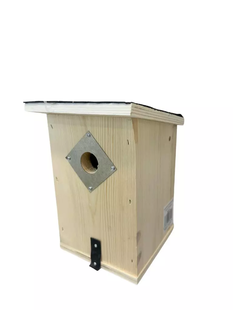 Pönttö 25 x 12 x 15cm. Asfalttikatto, peltivahvike aukossa. Avattava pohja. Runko raakalautaa, katto ja pohja filmivaneria. Pohjan kiinnitys lukittuu käännettävällä metallikoukulla. Aukko 28mm... Lue lisää