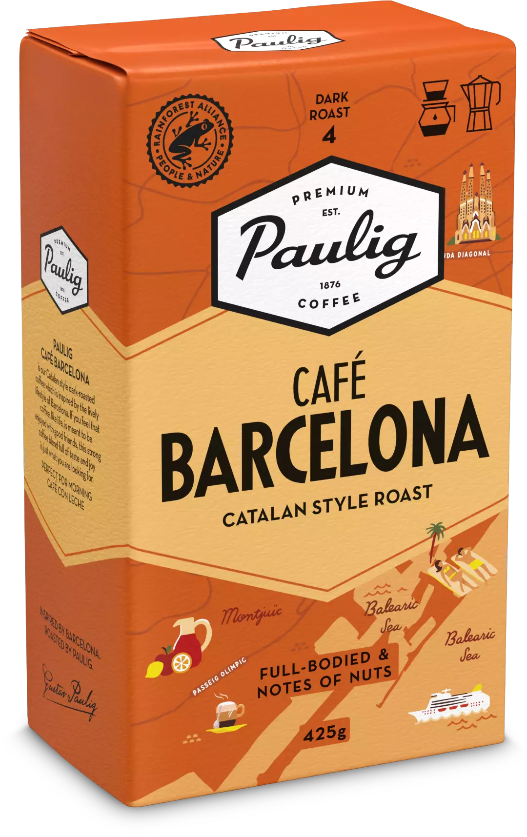 Paulig Café Barcelona on täyteläinen tummapaahto, joka vie ajatukset Välimeren lämpöön ja kiireettömiin iltapäivän kahvihetkiin. Suodatinkahvisekoituksen tumman kahvin maku on hersyvä, tumman paahteinen ja siinä on pähkinäsuklaisia vivahteita. Paulig Café Barcelona kahvi on Pauligin kaupunkikahvi, joka on saanut inspiraationsa Barcelonan eläväisestä kaupunkitunnelmasta, jossa iltapäivän kahvihetkelle otetaan aikaa ja siitä nautitaan kaikin aistein. Paulig Café Barcelona kahviin vivahteikkuutta tuovat Etelä-Amerikan kahvilaadut sekä ryhdikkyyttä intialainen robusta. Paahtoaste 4. Rainforest Alliance -sertifioitu. Lisätietoa: ra.org. • Tummapaahtoinen (4/5), täyteläinen suodatinkahvi pähkinäsuklaisilla vivahteilla • Nauti virkistävänä iltapäiväkahvina tai kiireettömästi ystävien seurassa• Valmistus suodatinmenetelmällä tai mutteripannulla