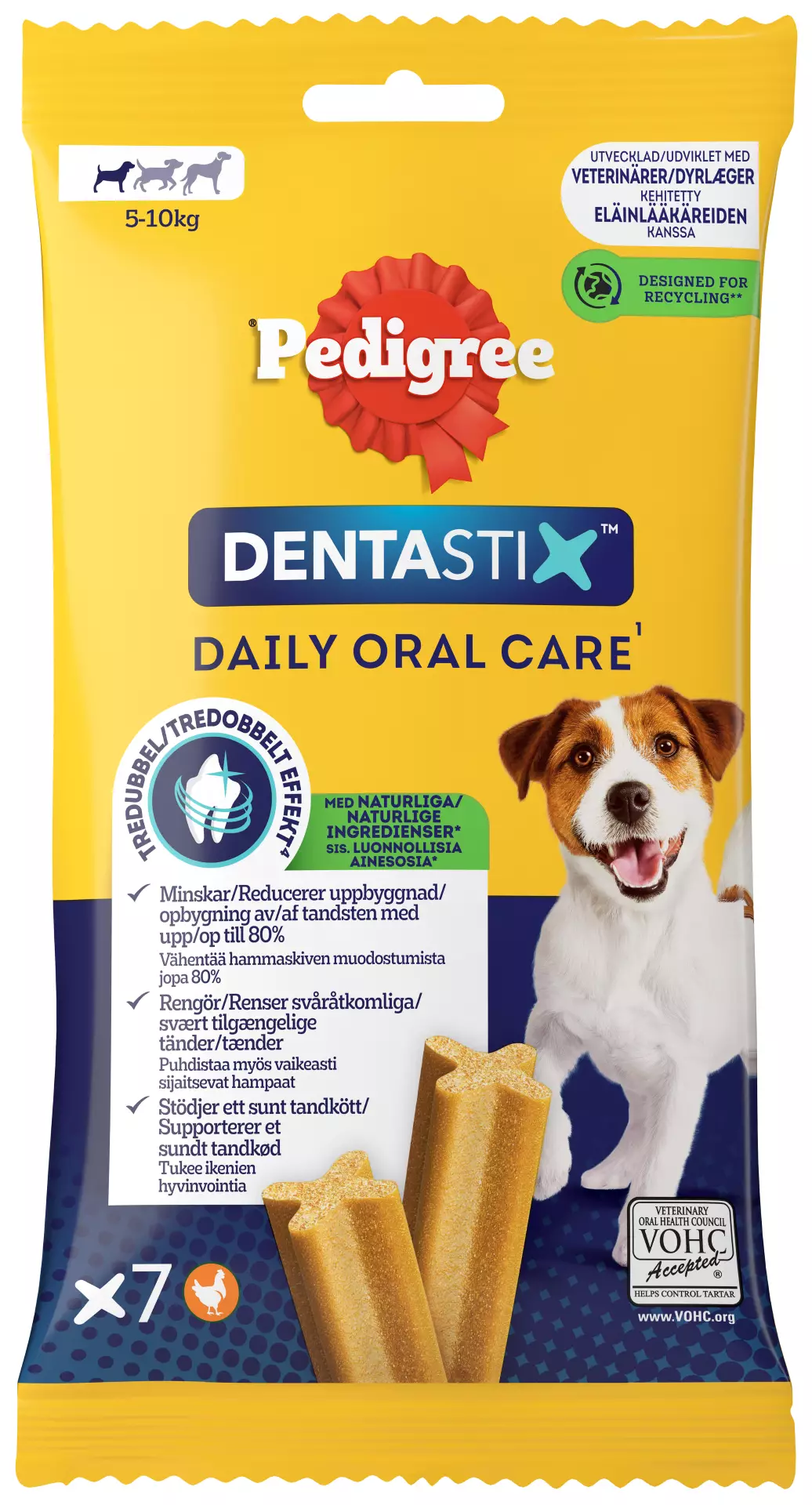 Neljällä viidestä yli 3-vuotiaasta koirasta on iensairaus, joka johtuu hammaskiven ja plakin muodostumisesta. PEDIGREE ® DENTASTIX™ Daily Oral Care -purupalojen TRIPLE ACTION vaikutuksen on tieteellisesti todistettu vähentävän päivittäisessä käytössä hammaskiven muodostumista jopa 80%, puhdistavan vaikeasti sijaitsevia hampaita ja tukevan ikenien hyvinvointia. ? Ainutlaatuinen x-muoto ? Vähärasvainen ? Ei keinotekoisia värejä ja aromeja
