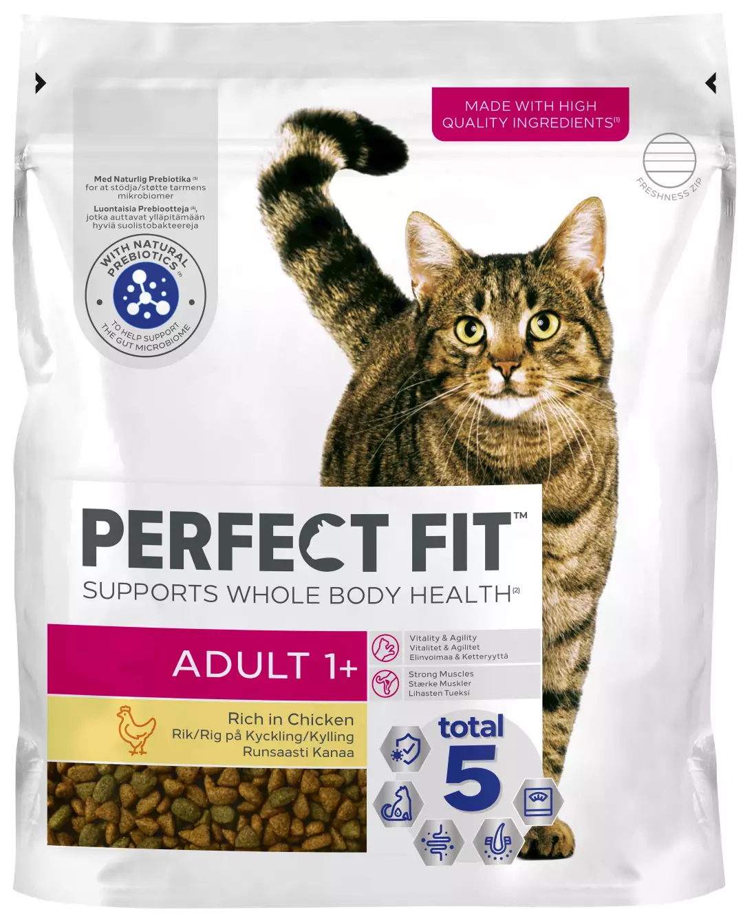 Ainutlaatuisen PERFECT FIT™ Total 5 -koostumuksen lisäksi Adult tuo tullessaan kolme täydentävää etua aikuisten kissojen erityistarpeisiin: Elinvoimaa ja liikkuvuutta - Kattava ja tasapainoinen ravinto tukee kissan elinvoimaa. Sisältää enemmän B-vitamiinia ja rautaa, jotka auttavat ylläpitämään kissasi liikkuvuutta. Hyvinvoivat ikenet ja hampaat - Rapea rakenne auttaa tunnetusti puhdistamaan hampaita, mikä on hyväksi ikenille. Vahvat lihakset - Korkea pitoisuus valittuja proteiineja tukee vahvojen lihasten kehittymistä.