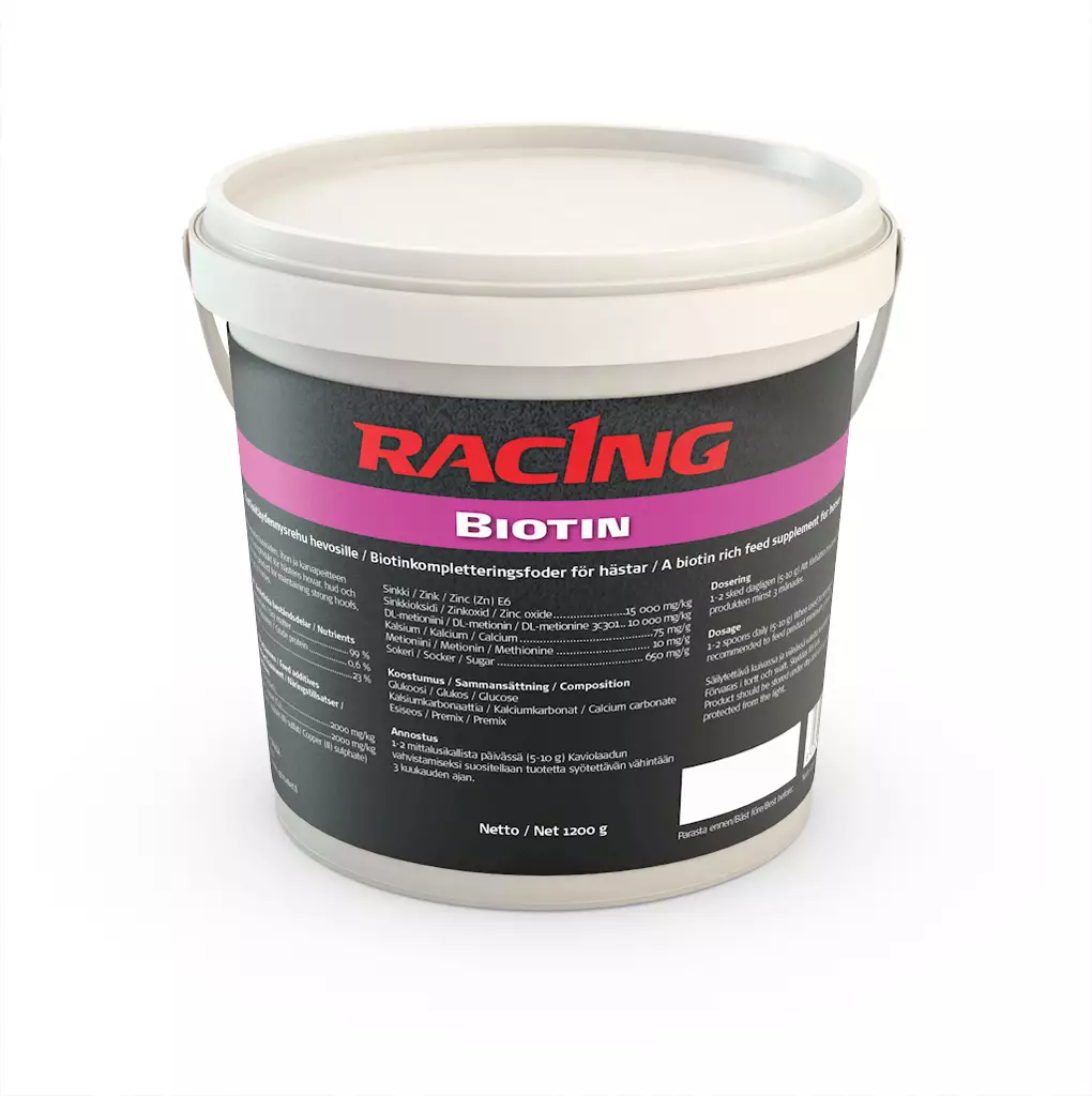 Kaviot ja iho tarvitsevat biotiinia pysyäkseen terveinä, mutta biotiini ei yksin riitä. Racing Biotin -valmisteen sinkki, kupari, kalsium ja metioniini auttavat hevosta saamaan kaikki sarveiskudosten hyvinvointiin tarvittavat hivenaineet , jotta kasvavan kavion laatu pysyisi kestävänä ja iho terveenä. Myös hyvälaatuinen karvapeite vaatii kehittyäkseen näitä samoja hivenaineita. Racing Biotin on maittava biotiinivalmiste hevosen karvapeitteen, ihon ja kavioiden hyvinvoinnin turvaamiseen. Maittavuuden varmistaa kantoaineena käytetty glukoosi.