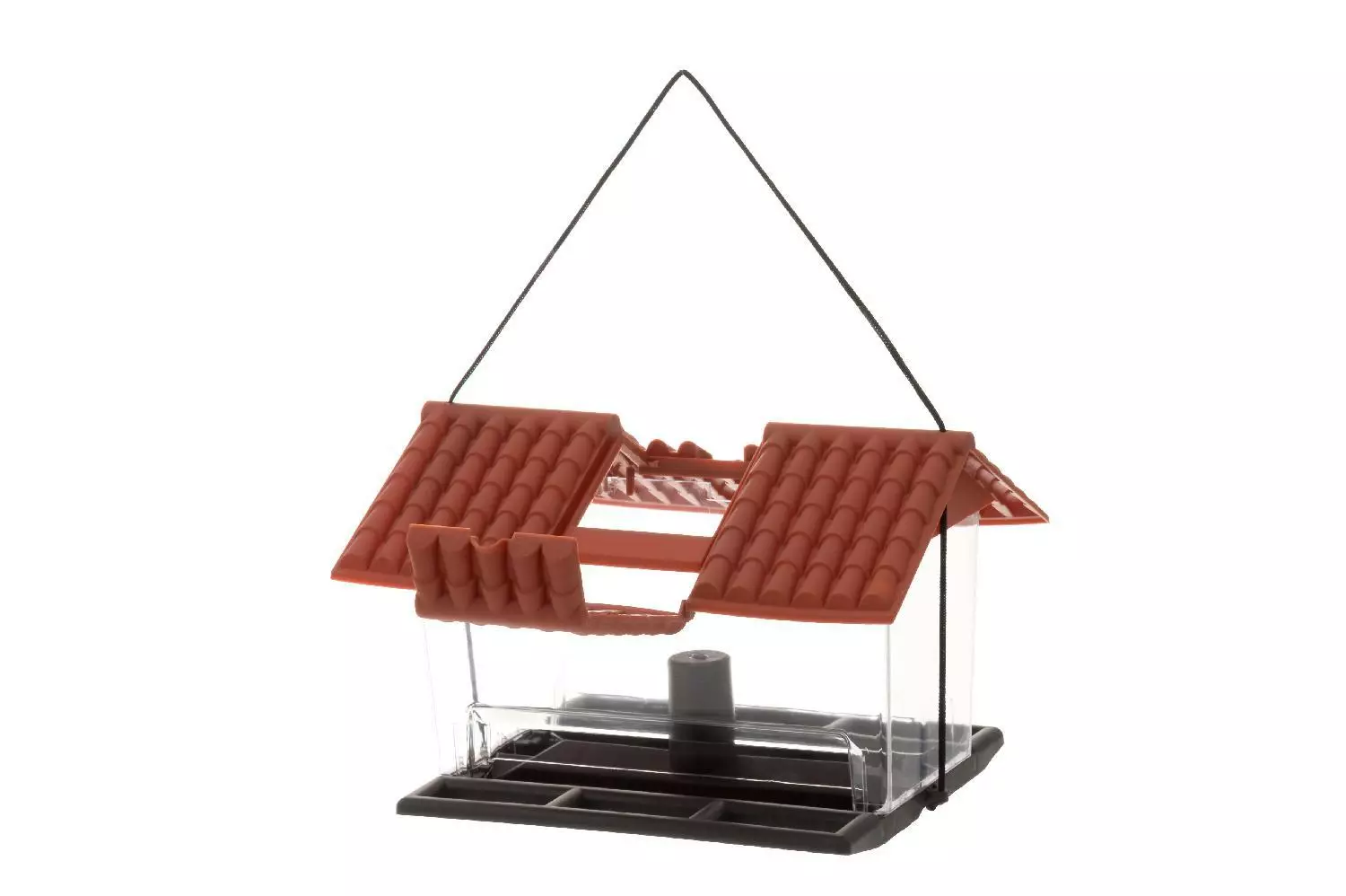 Käytännöllinen jyväsyötin läpinäkyvällä syötinosalla. Helppo seurata paljonko siemeniä on vielä jäljellä. Katon keskiosa avautuu täyttämistä varten.