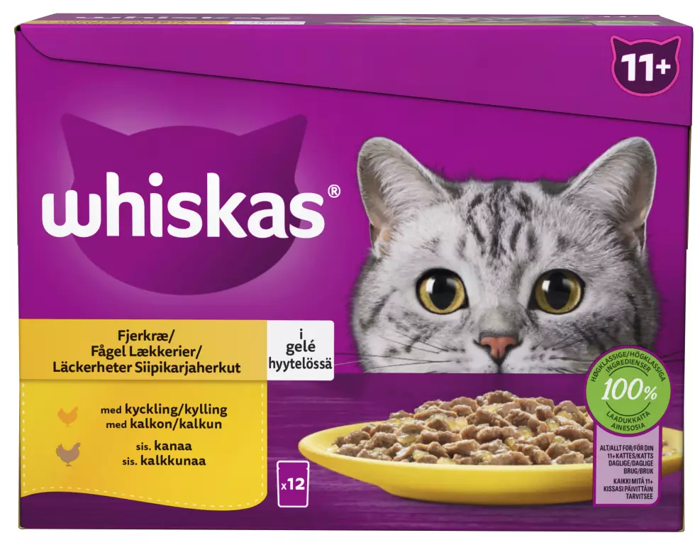 WHISKAS -ruokien valmistajat tietävät, että seniorikissa tarvitsee hieman enemmän huolenpitoa. Tämän vuoksi olemme kehittäneet kissallesi uuden suosikkireseptin; mureita lihaisia paloja lempeässä ja maukkaassa kastikkeessa. Tukee sydämen hyvinvointia: • sisältää tauriinia, joka auttaa tukemaan sydämen hyvinvointia Helppo syödä & optimaalinen sulavuus: • Valikoiman ateriat sisältävät pienempiä ruokapaloja, jotka ovat suunniteltu erityisesti vanhenevien kissojen ruoansulatusta ajatellen. Näin kissasi voi olla täysin tyytyväinen. Tukee virtsateiden hyvinvointia: • Kivennäisaineet ovat tasapainoisessa suhteessa virtsateiden hyvinvoinnin tukemiseksi.